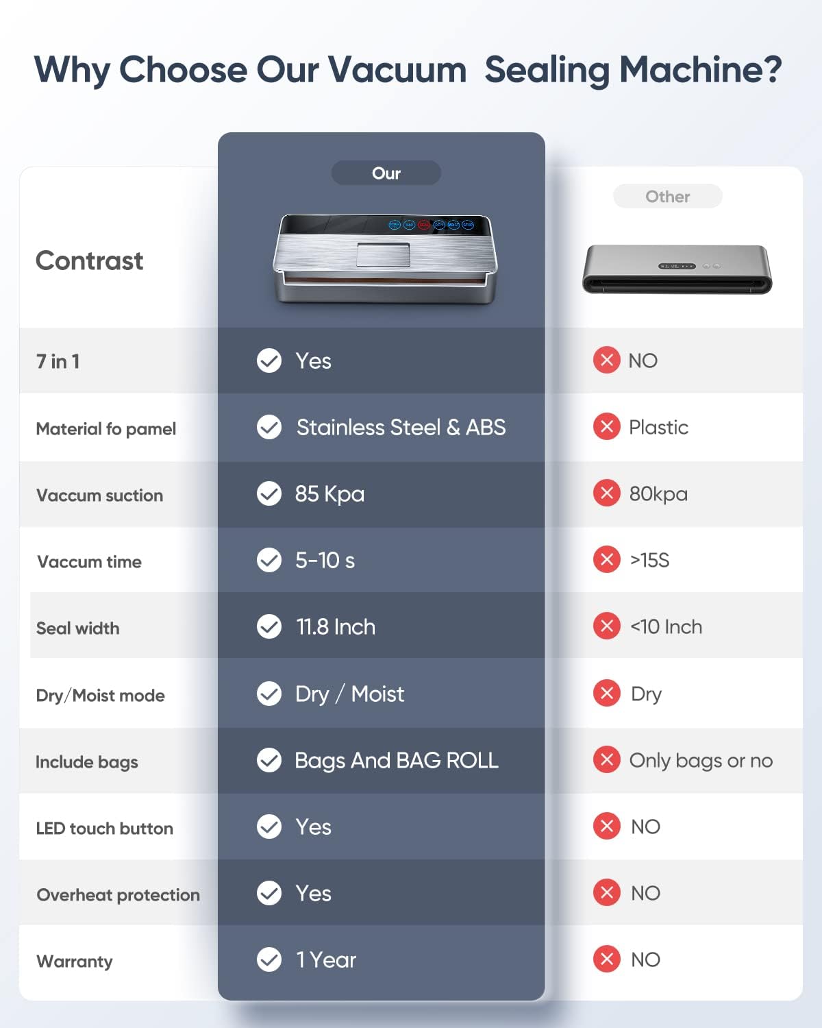 • 【User-Friendly Experience】sealer machine designed with fully automatic vacuum sealing operation, All stainless steel panel, LED indicator lights, electric plug in and the digital touch controls panel provides a user-friendly experience for you