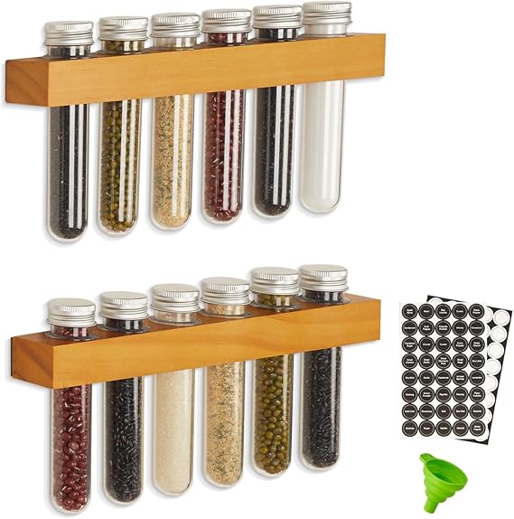 Spice Rack Magnetic For Fridge, Wood Spice Rack Shelf Set Wall Hanging With Storage Tubes And Labels For Kitchen Cabinet Or Pantry Door 2-Pack (2, Brown)