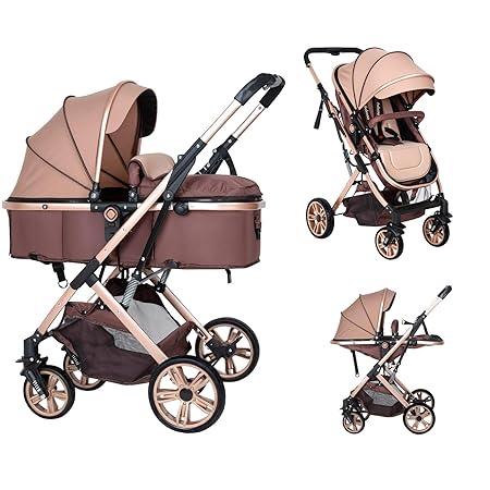2 in 1 Convertible Baby Stroller Newborn Reversible Bassinet Pram, Foldable Pushchair with Adjustable Canopy Folding High Landscape Infant Carriage, Anti-Shock Toddler Pushchair
