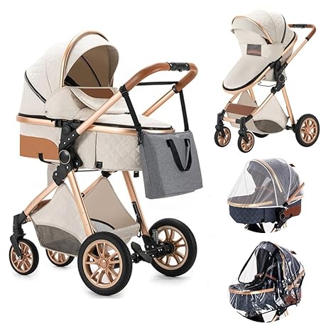 2 in 1 Portable Baby Stroller Reversible Quick-Fold High Landscape Aluminum Frame Infant Stroller for Newborn Off White
