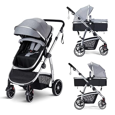 Baby Stroller, 2-in-1 Reversible Stroller with Bassinet Mode, Foldable Infant Stroller with Canopy, One Button Brakeä_«Adjustable Handle, Newborn Stroller (Gray)