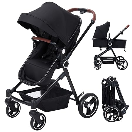 GAOMON 2 in1 Baby Stroller, High Landscape Infant Stroller, Reversible Bassinet Pram Stroller, Pushchair Adjustable Backrest & Canopy, Foldable Aluminum Alloy Anti-Shock Stroller for Newborn (Black)