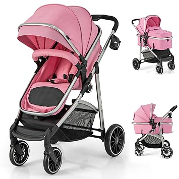 HONEY JOY 2 in 1 Convertible Baby Stroller, Folding High Landscape Infant Bassinet Stroller w/Reversible Seat, Removable Foot Cover, Adjustable Backrest & Canopy, Toddler Pushchair for Newborn (Pink)