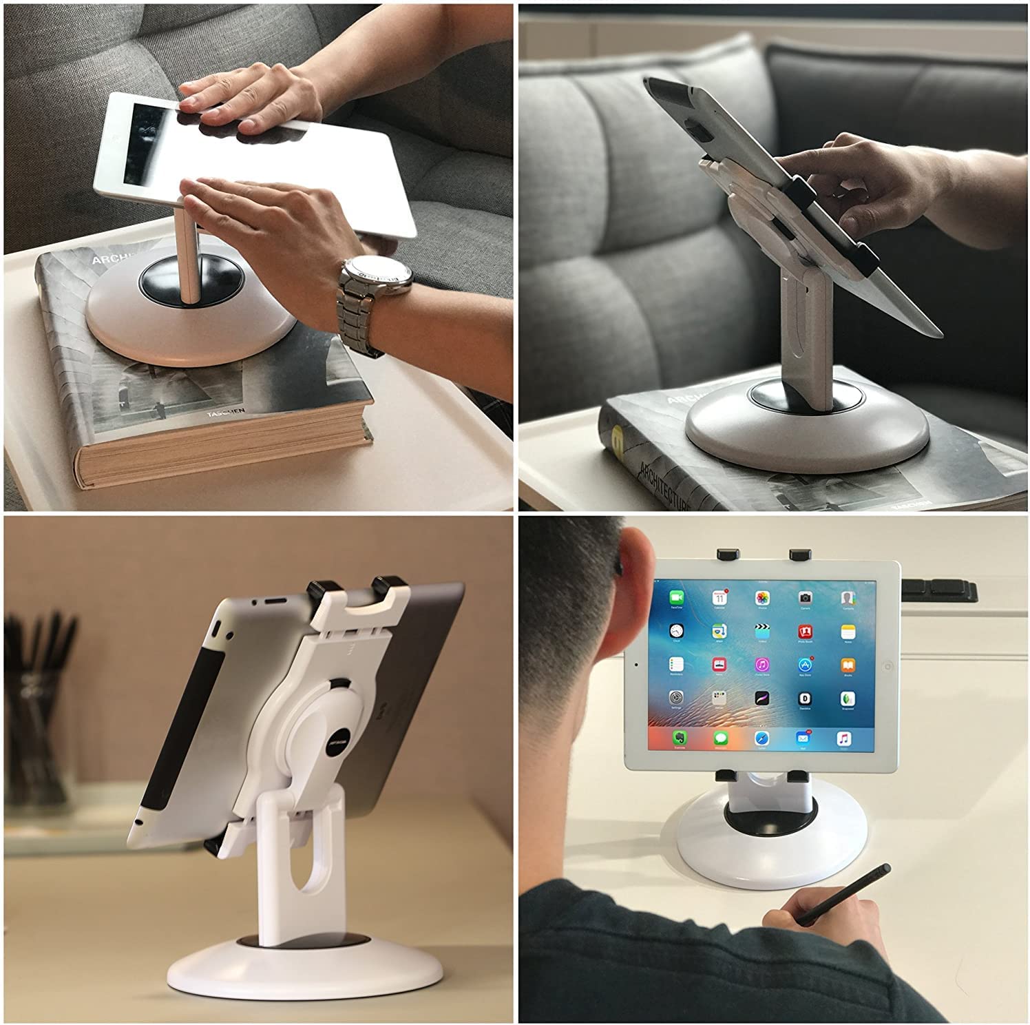 • Steady support - Light and smooth turning of bracket holder/arm provides high efficiency in busy settings. The weighted base plus hard folding arm offer sturdy structure to withstand weights of large tablets and heavy operation on the device, a professional grade tablet stand.