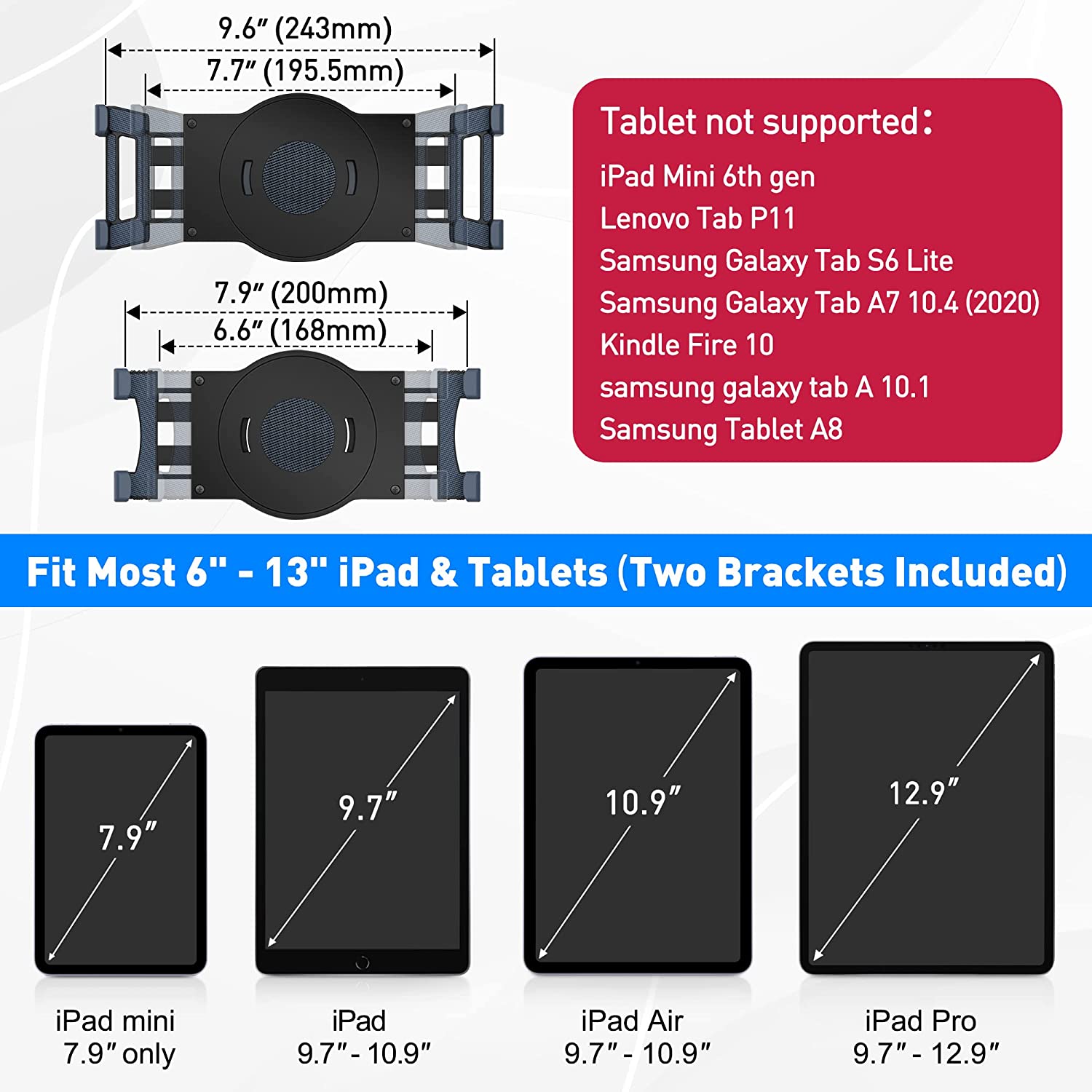 • Business-oriented - Two size rubber padded bracket holders collectively fit 6" - 13" tablets or any gadgets with width or height measurement in the range of 6.6"-9.6" (Please noticed that both two clips fit cases less than 0.5" thickness), An ideal docking station stand for perfect match of large or small tablet pcs typically used at restaurant shop point of sale, office home desk, etc.