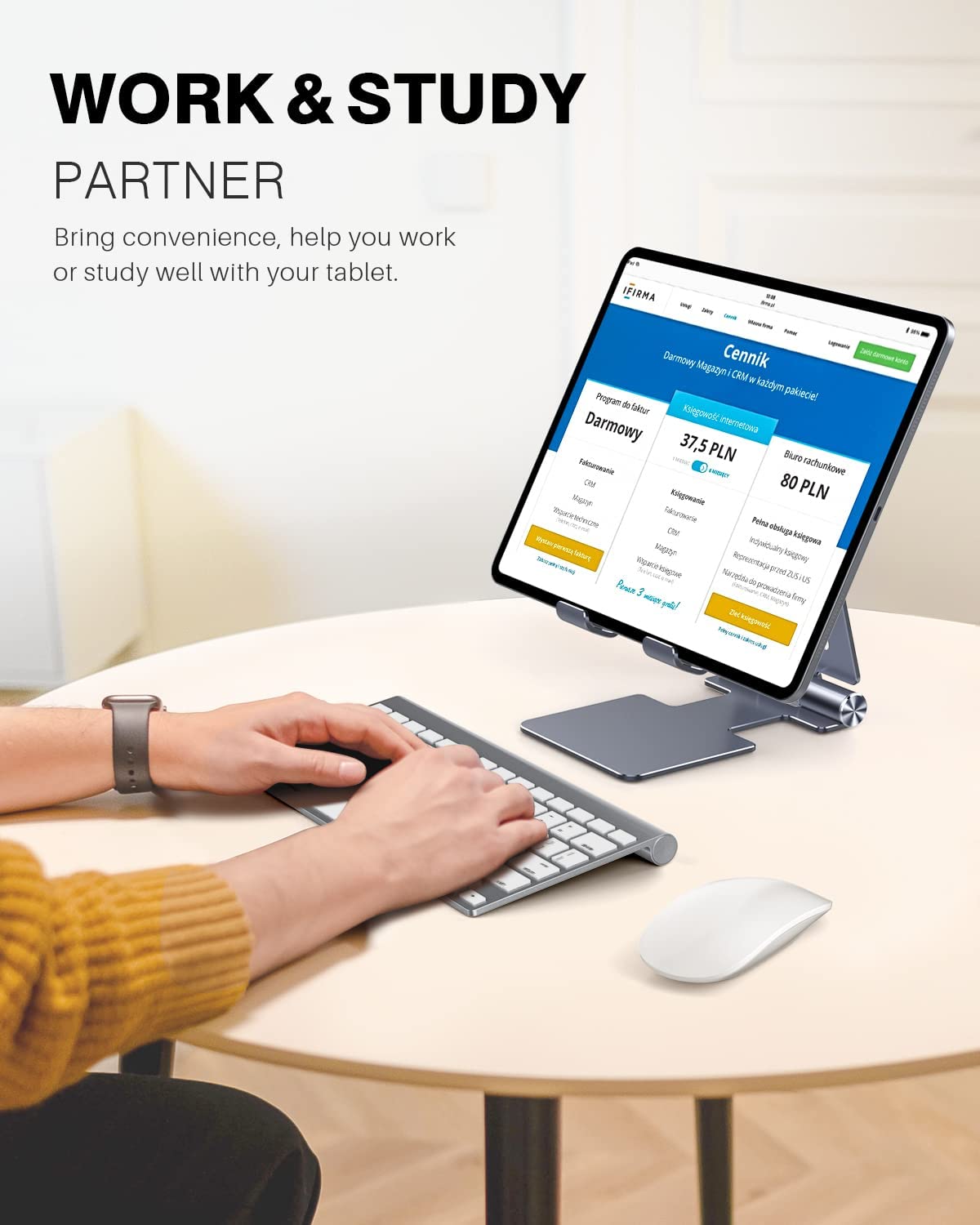 • 💼[Fully Foldable to Pocket Size]: The tablet stand for desk can be fully folded flat for easy storage, perfectly to fits in the pocket or slip into a bag. Small footprint only taking up little place on your desk, counter or kitchen. Compact and portable to carry out for travel.