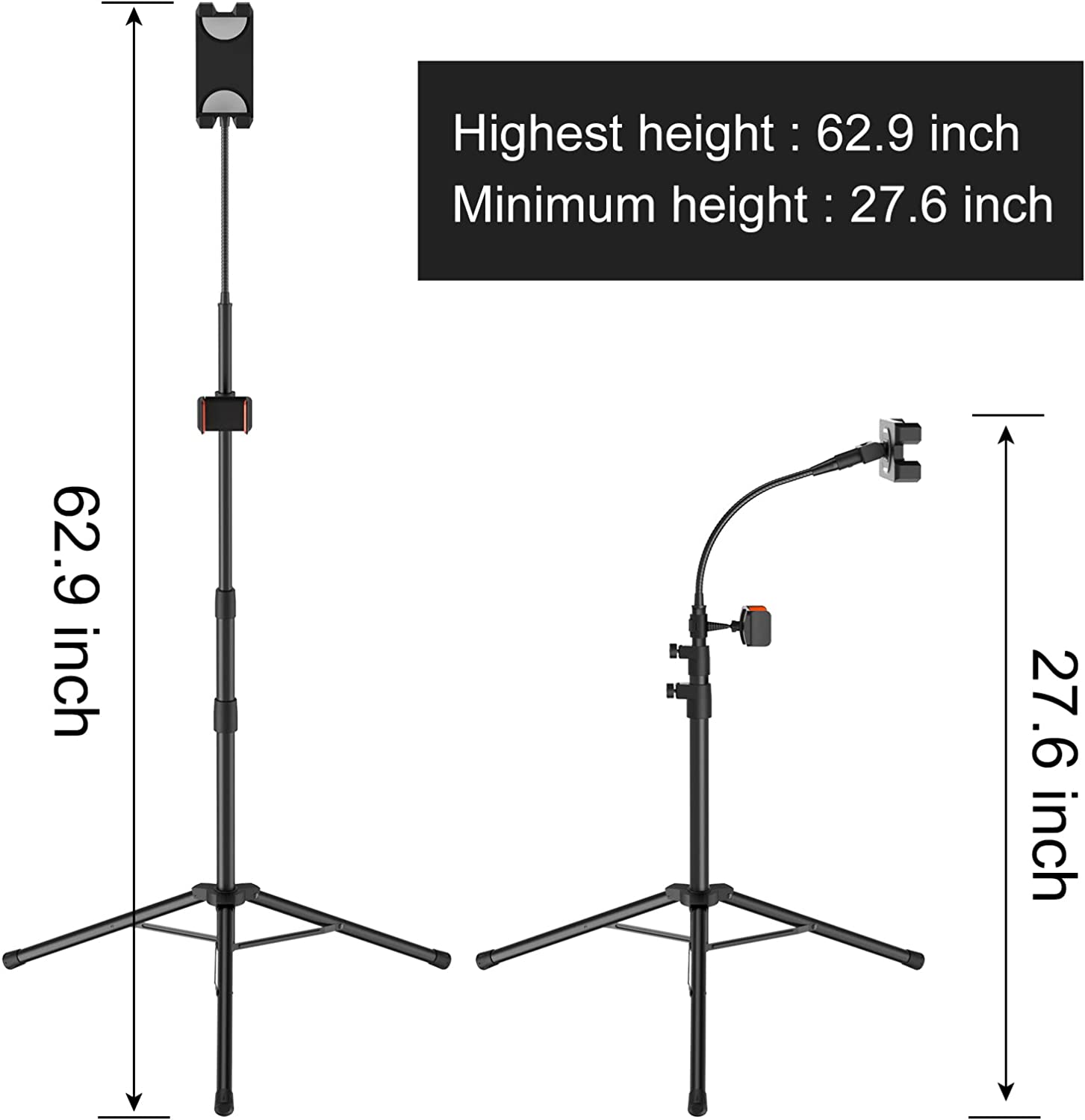 • 【360 degree rotation and height adjustable】 - The tablet holder can be rotated 360 degree, making it easy to switch your tablet from portrait mode to landscape mode. Our iPad stand also allowing height adjustment from 27.6 to 63 inches, you can easily get your desired angle to meet your needs at different angles and positions. perfect for video recording, video watching, chat and more outdoor activities.