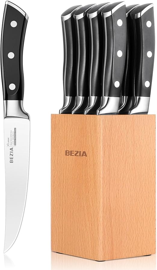 BEZIA Steak Knives Set with Block, Non Serrated Steak Knife Set of 8, 5 inch Razor Sharp German Steel Steak Knives Set - Full Tang Handle