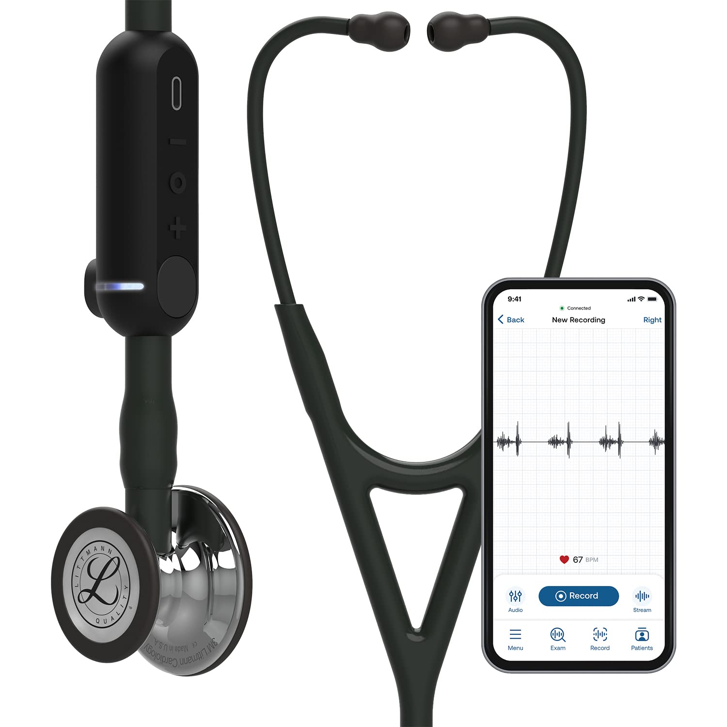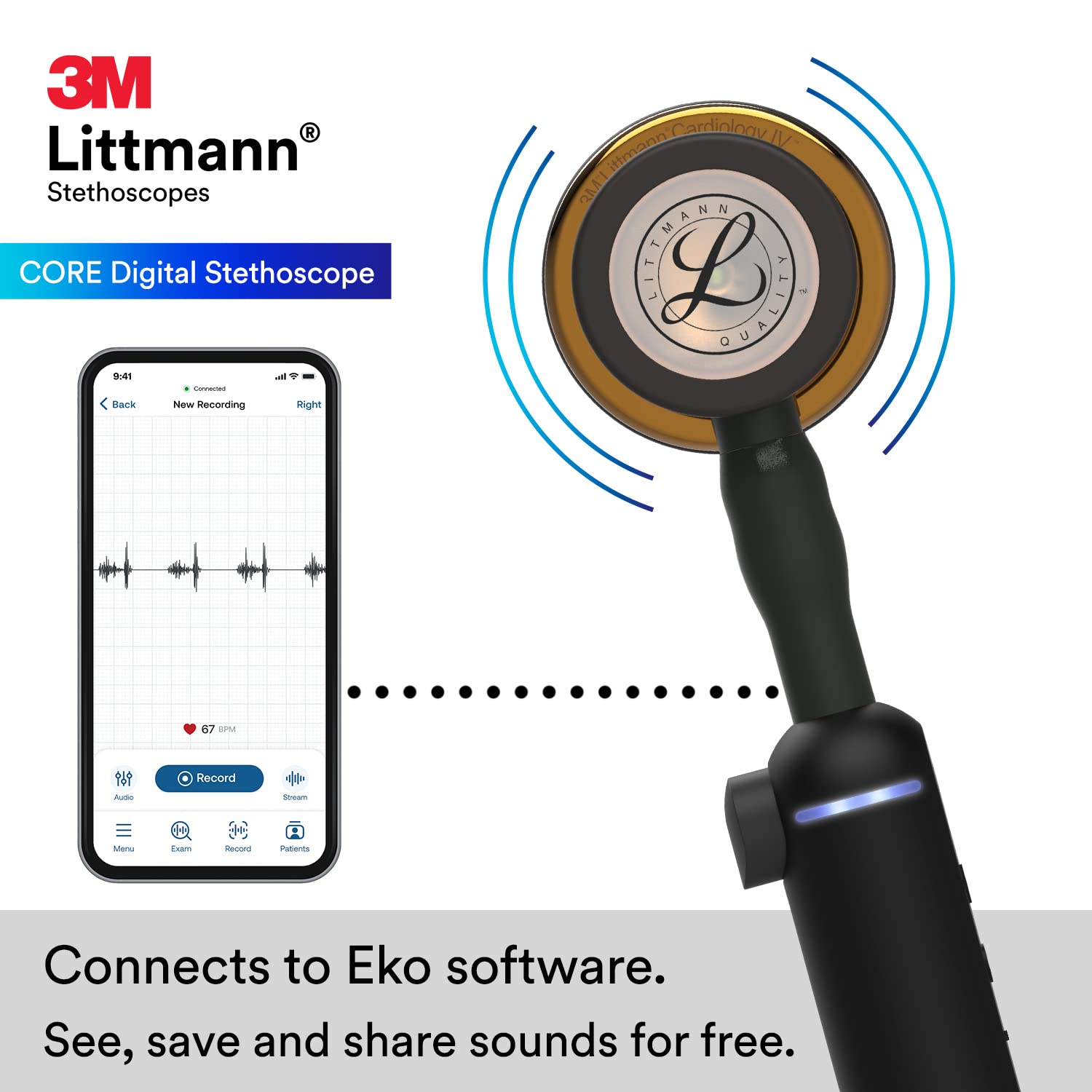 The 3M Littmann CORE Stethoscope works with Eko software on iOS and Android devices, giving you a HIPAA compliant means to save and annotate 15, 30, 60 or 120-second recordings in a secure dashboard. Create a library of heart sounds to monitor the progressions of a disease or for education, and securely share recordings with colleagues.