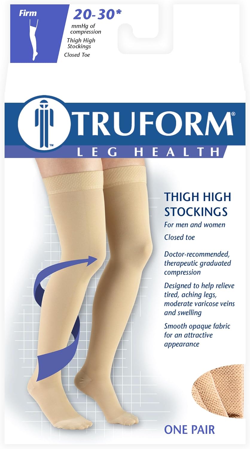 Truform 20-30 mmHg Compression Stockings for Men and Women, Thigh High Length, Dot Top, Closed Toe, Beige, Large