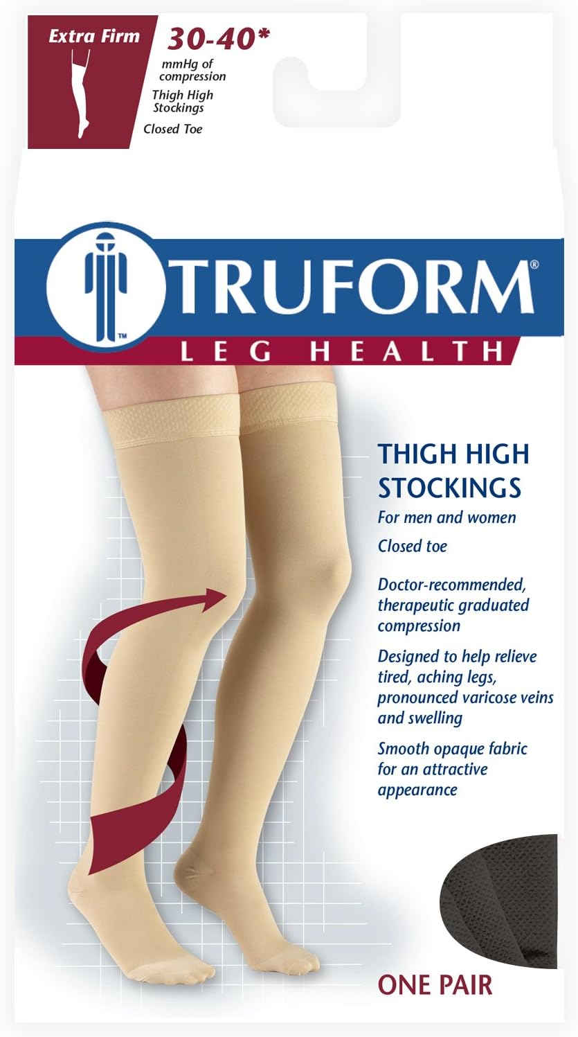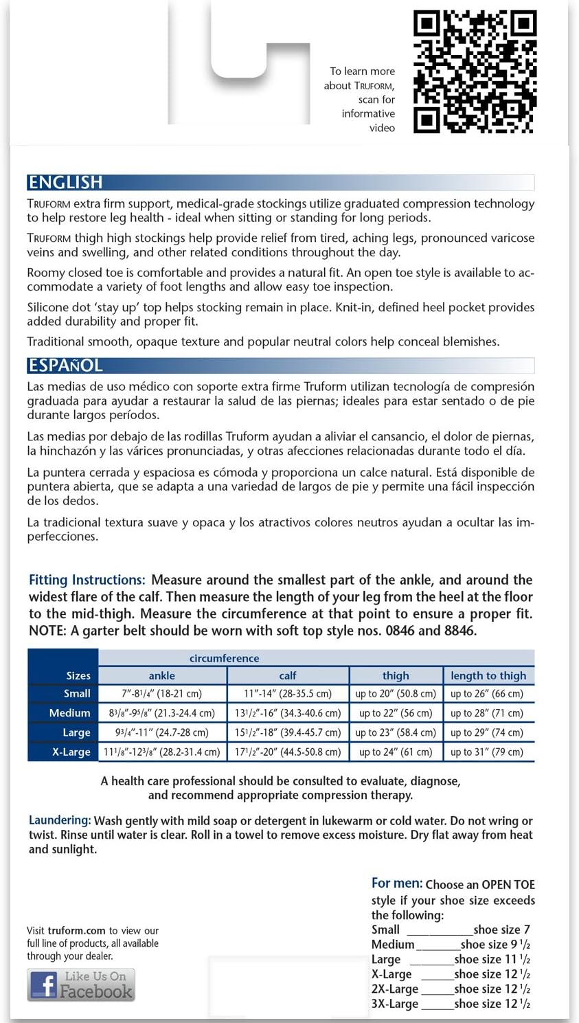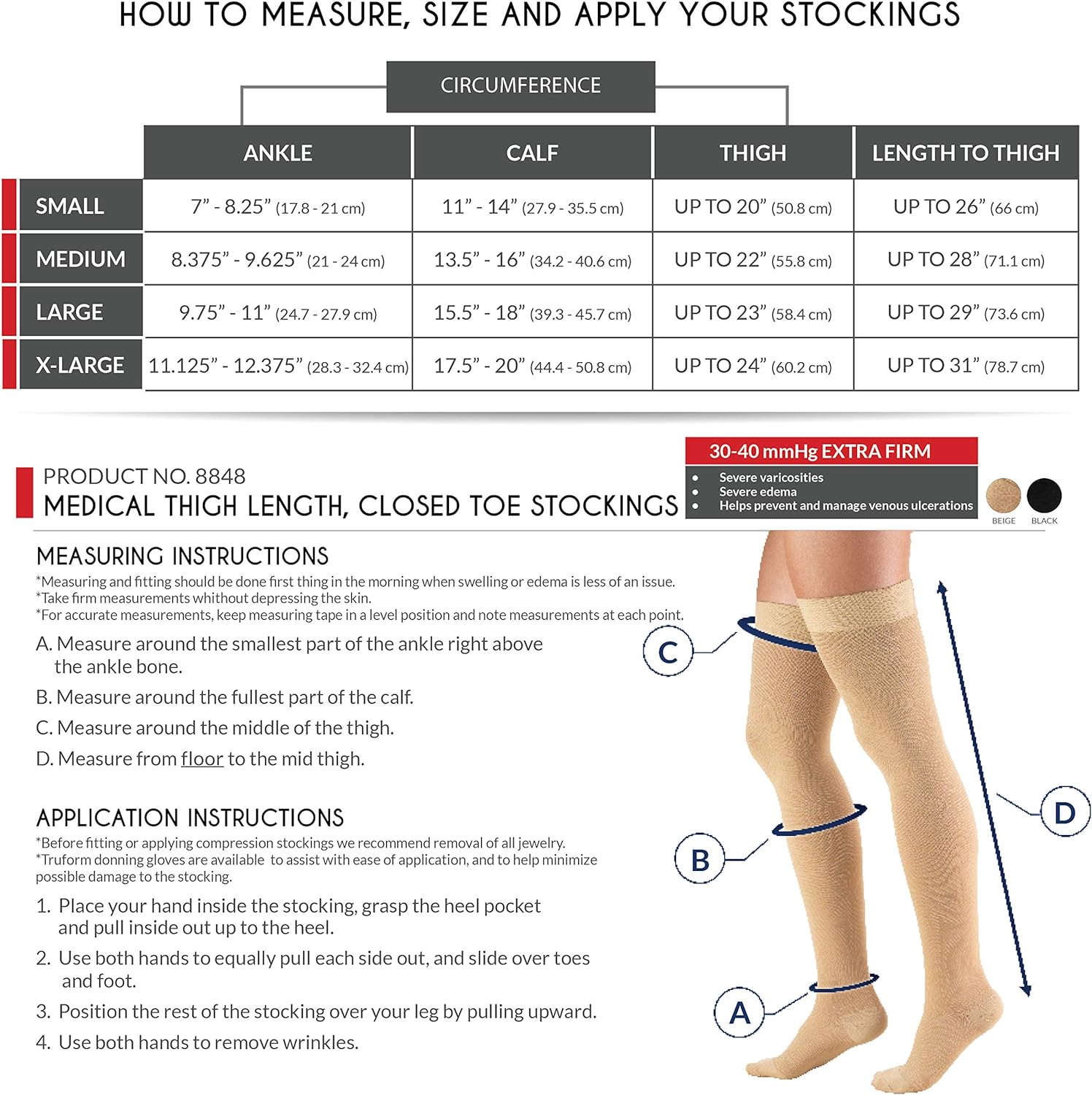Truform 8848 was created to help relieve conditions associated with poor circulation. Graduated compression technology delivers a compressive action to the leg that is greatest at the ankle, then gradually decreases toward the heart. The 30-40 mmHg very firm compression level is great for post surgery and severe edema, varicose veins, spider veins, hypotension, post thrombotic syndrome (PTS), post sclerotherapy, and more. Truform therapeutic medical stockings feature classic styling and a smooth knit fabric that helps conceal unsightly conditions. The closed toe offers a more natural stocking feel. Color options are basic neutrals for all-occasion wear. Truform stockings, socks and pantyhose feature Graduated Compression Technology, which delivers a compressive action to the leg that is greatest at the ankle, then gradually decreases toward the heart. Graduated compression provides two primary benefits: it helps reduce and prevent swelling for the wearer, and the compression action help to prevent the slowing of blood flow so it can flow more quickly up the leg back toward the heart. Truform graduated compression support hosiery helps maintain positive circulation and leg health. We take the extra time and effort necessary to insure a therapeutically effective, comfortable fit. The combination of state-of-the-art materials and equipment, plus knitting know-how sets Truform apart from the crowd to make your legs look and feel great.