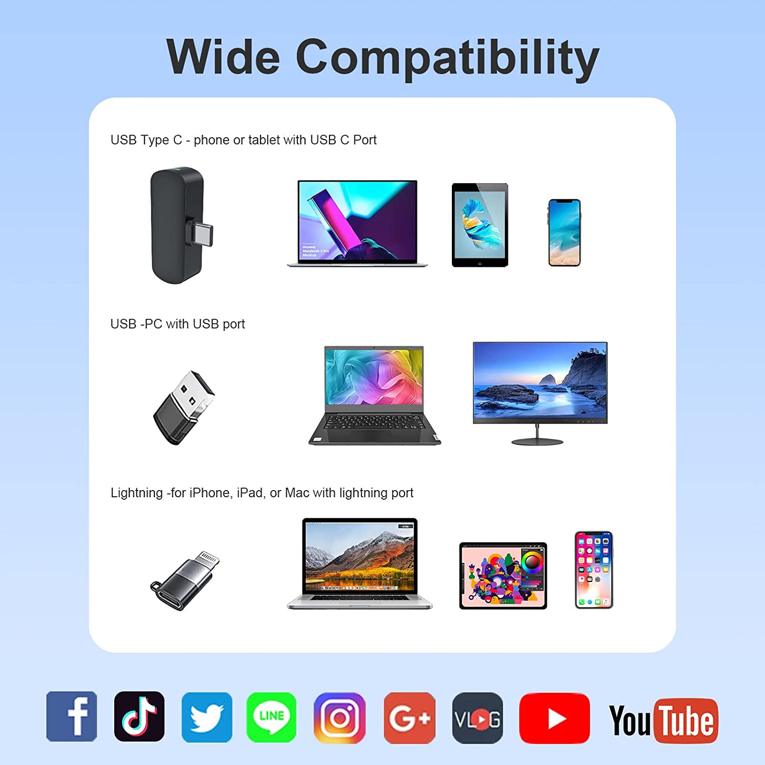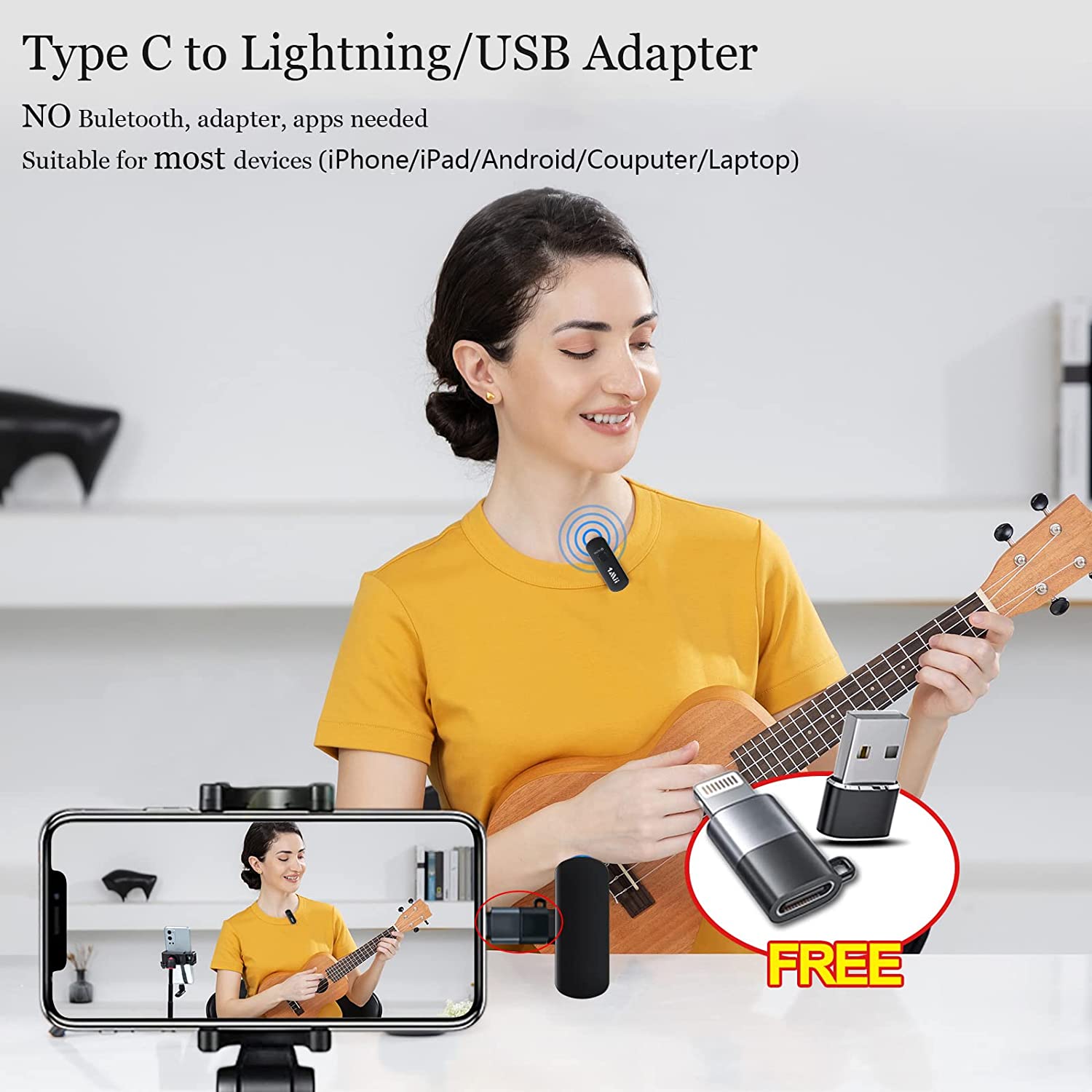 • 【𝐅𝐫𝐞𝐞 𝐓𝐲𝐩𝐞-𝐂 𝐭𝐨 𝐋𝐢𝐠𝐡𝐭𝐧𝐢𝐧𝐠& 𝐔𝐒𝐁 𝐀𝐝𝐚𝐩𝐭𝐞𝐫】 The M5 wireless lapel microphone USB C comes with an extra LIGHTNING adapter and a USB adapter, you can use it on iPhone/iPad/ Android/Computer/Laptop/Macbook. Widely Compatible with IOS/Android/Windows/MAC.