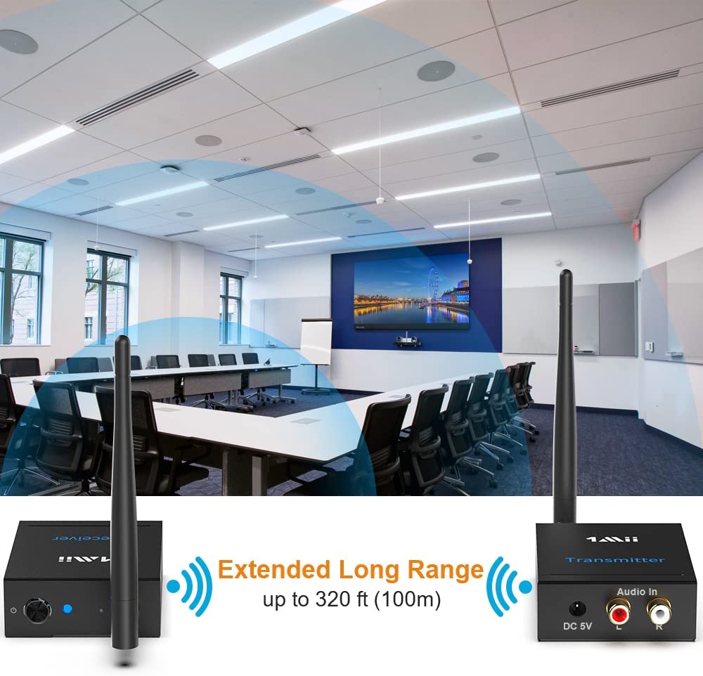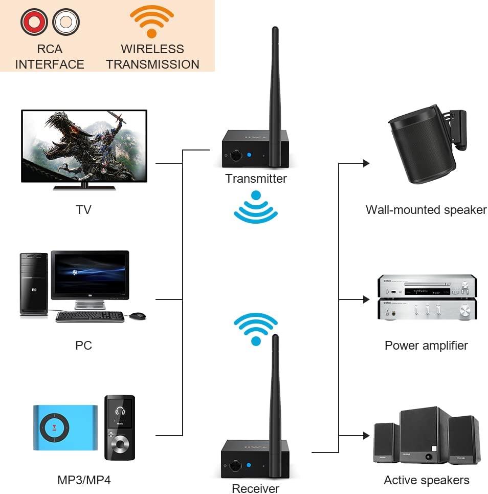 1Mii Wireless Transmitter Receiver Audio for Music, 2.4GHz Long Range 320 ft Audio Transmitter and Receiver Low Delay from TV/to Powered Speaker/Stereo/Subwoofer/Soundbar/RCA Out/in - RT5066