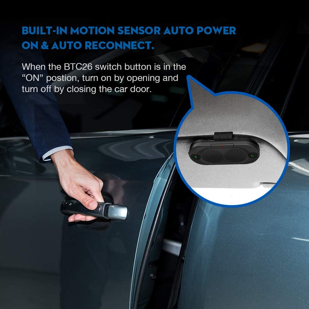 • BUILT-IN MOTION SENSOR for Auto Power On: Start driving without delay as this Bluetooth hands-free car kit switches to Auto Power and connects with your phone when car door is opened. 1000mAh Battery:Buit-in rechargeable 1000mAh battery, you could enjoy your smart phone music or handsfree calling up to 20 hours for a single full charge.