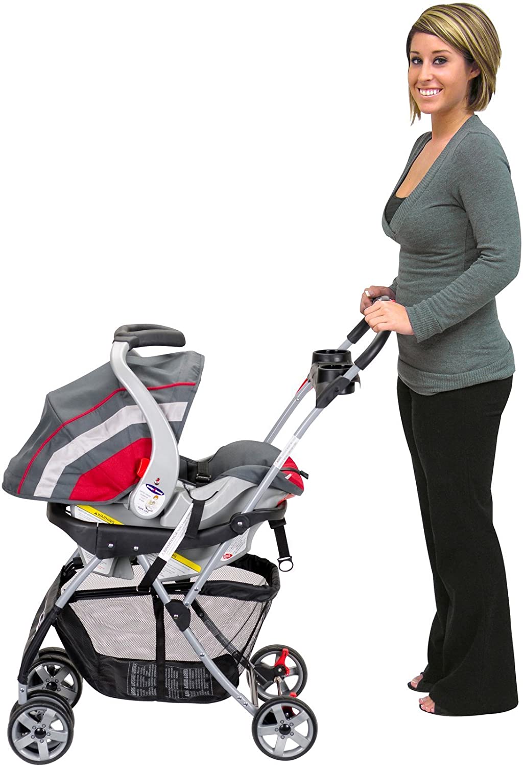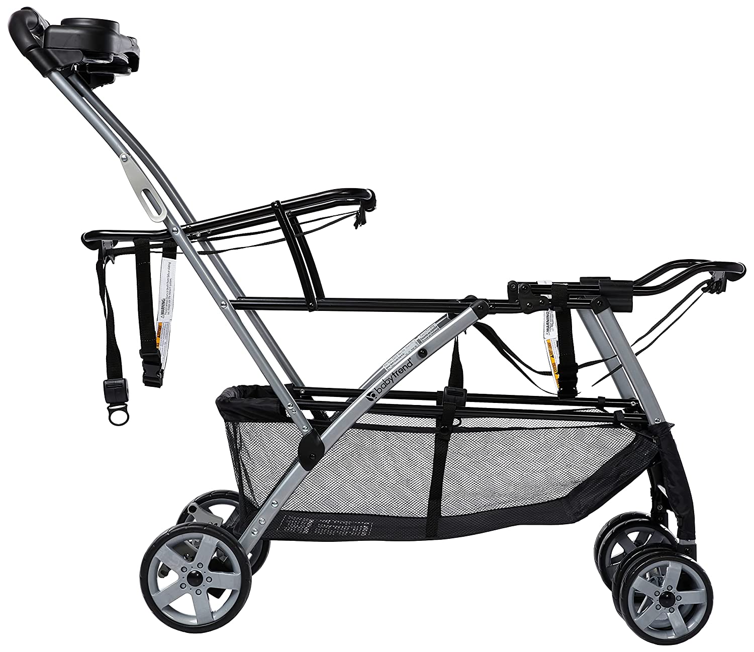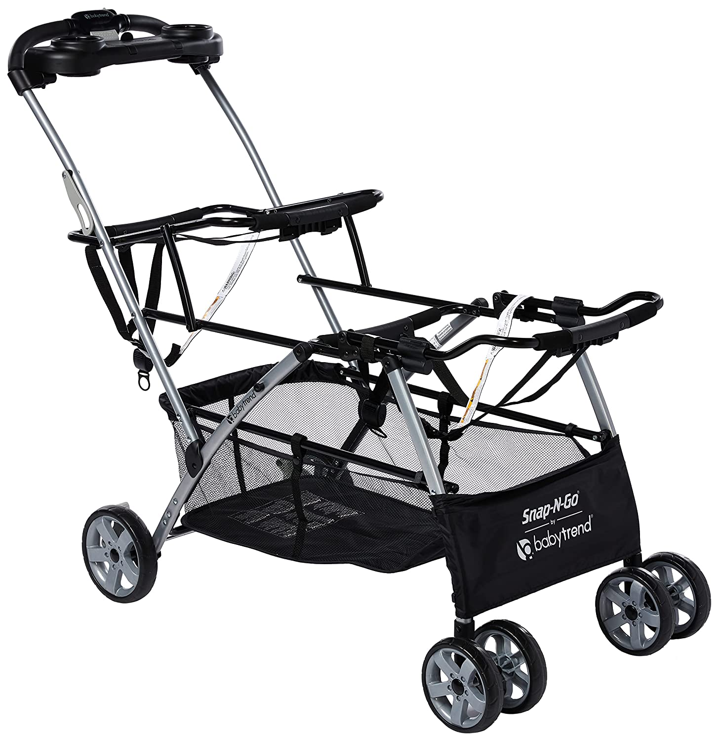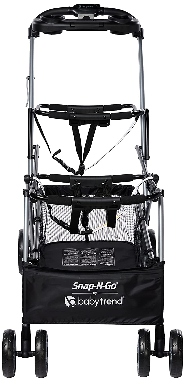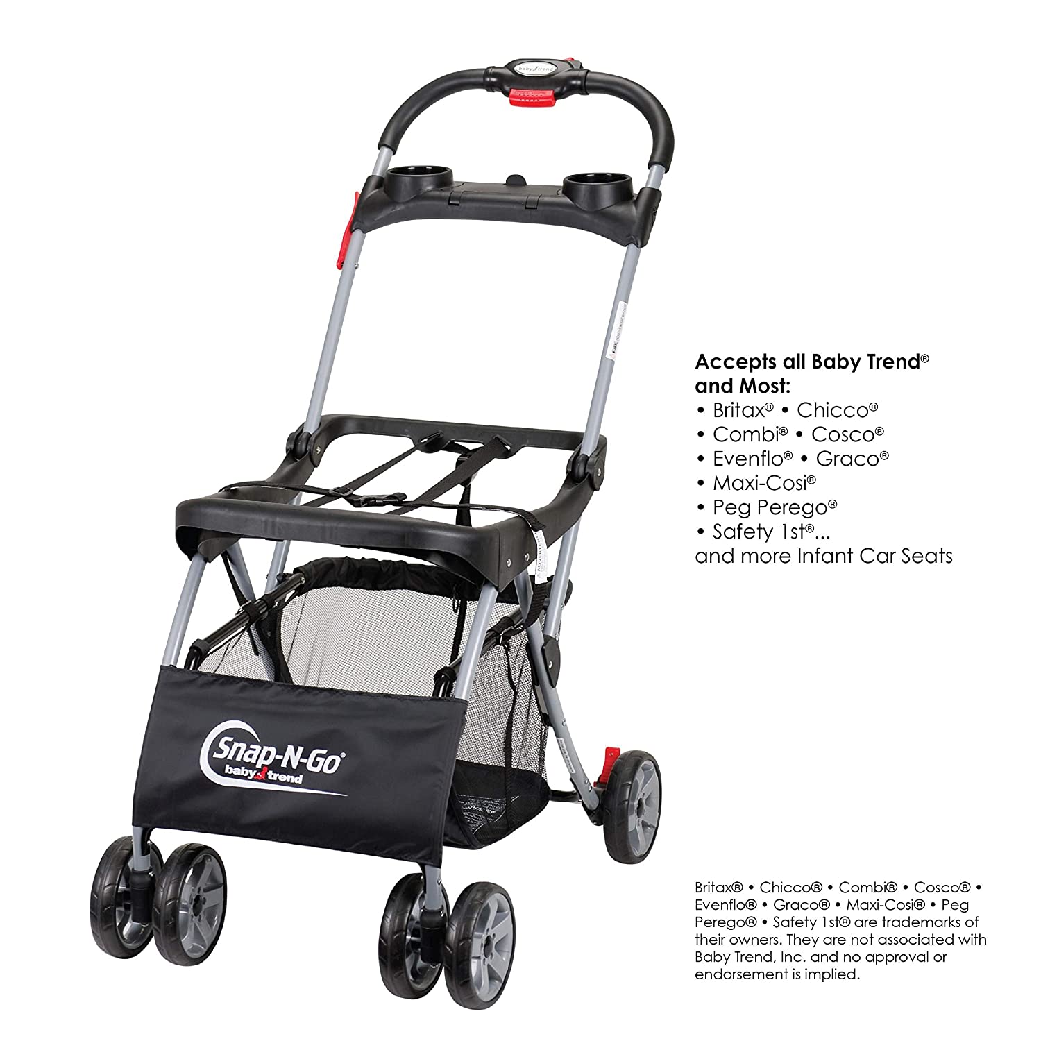 The new and improved Snap N Go EX Universal Infant Car Seat Carrier, will accept one infant car seat. It allows adults to place an infant car seat on the carriage frame without removing child from the infant car seat. A convenient 2 cup holder parent tray with covered storage compartment makes this stroller easy for travel. Lightweight and easy to transport the Snap N Go EX features a convenient one hand fold. For parents on the go, this stroller includes a large drop down storage basket to keep your necessities close by. Safety features includes rear wheels with brakes for stability, adjustment straps on the carriage frame to cradle the car seat, and the securing strap for securing the car seat onto the carriage frame. Accepts all Baby Trend Infant Car Seats. Place car seat onto the upper frame. Strap the safety belts over the car seat and connect the buckles together. Tighten the strap so it fits snugly and the car seat is secured to the frame. Tighten the bottom support straps, located on the back of the upper frame, by pulling back on the loop and sliding the adjuster forward for a snug fit. NOTE: Some car seats have a belt path for the safety belt to slide through. If you have a car seat with a belt path please feed the safety belt through it and secure.