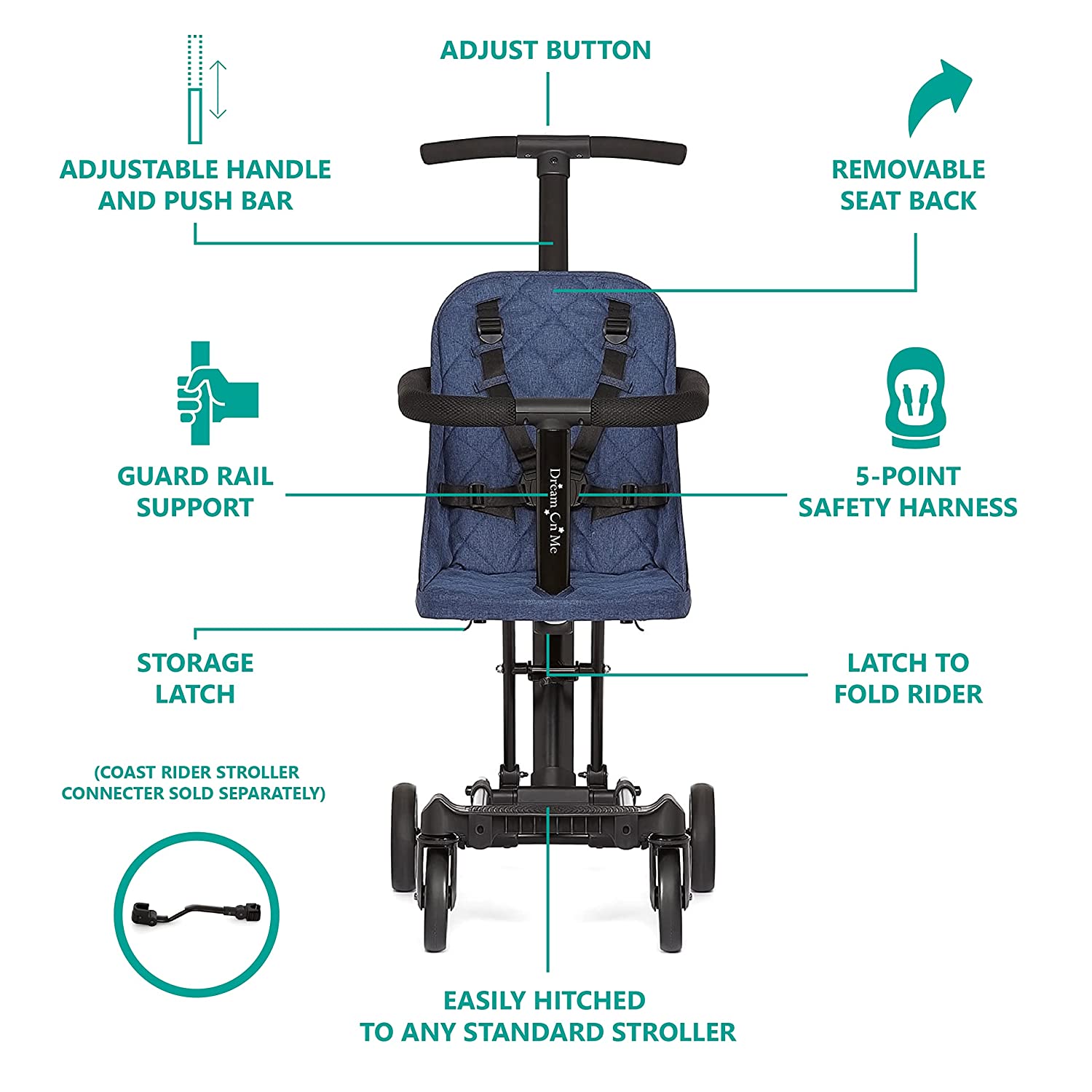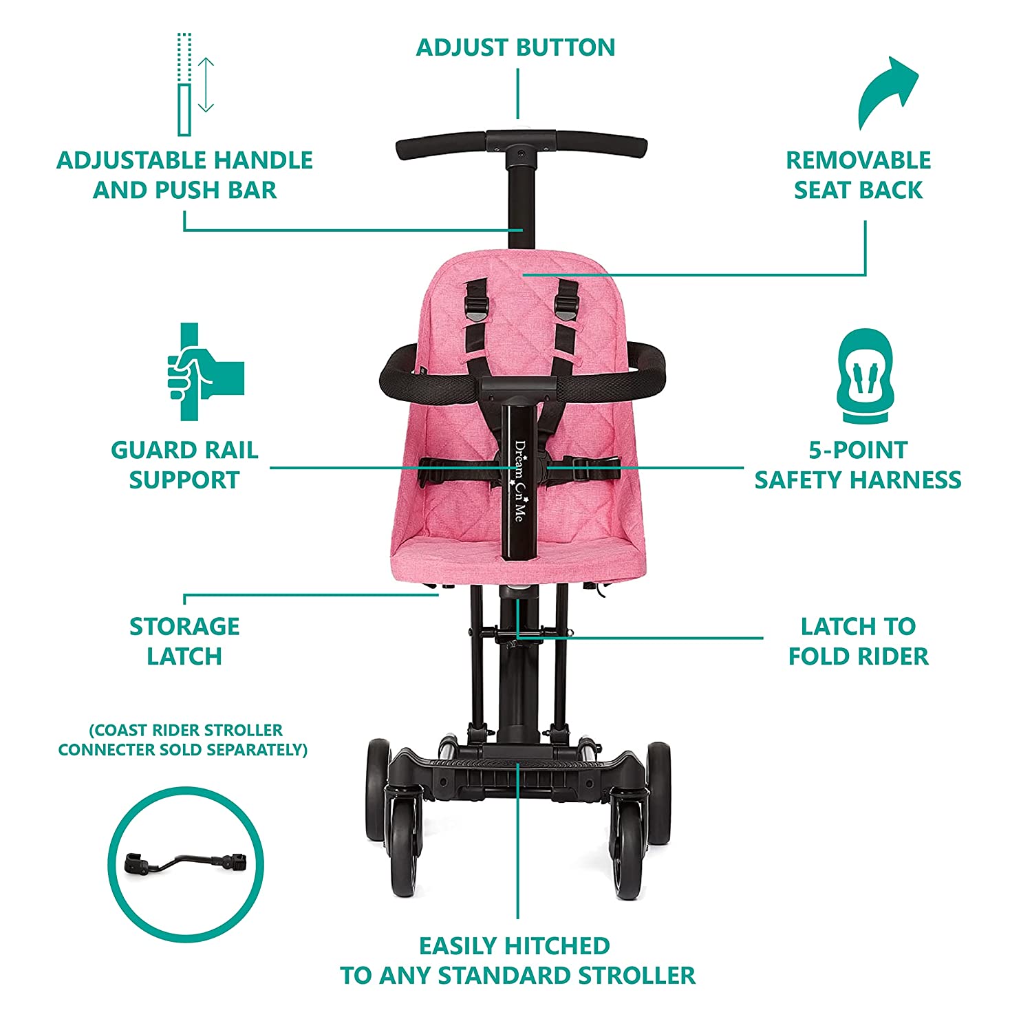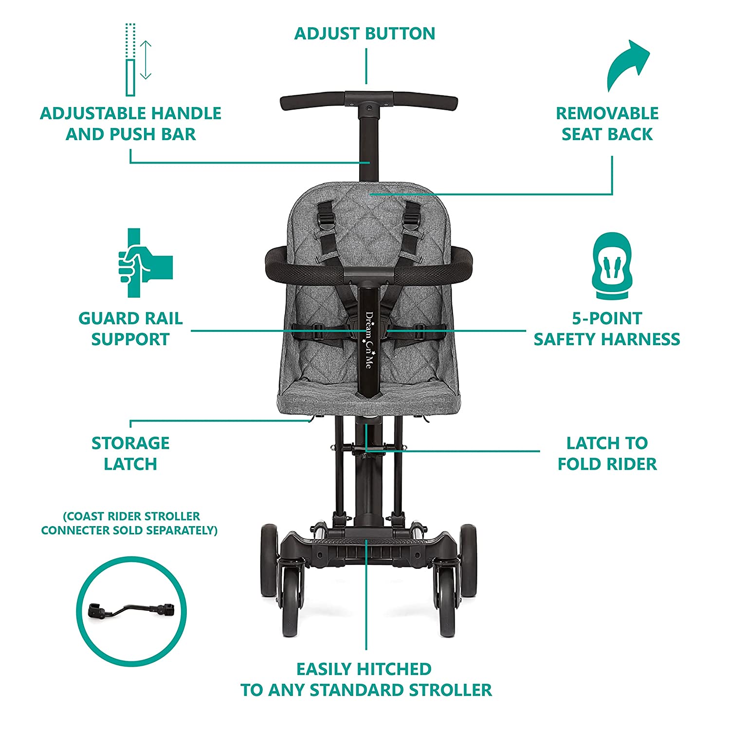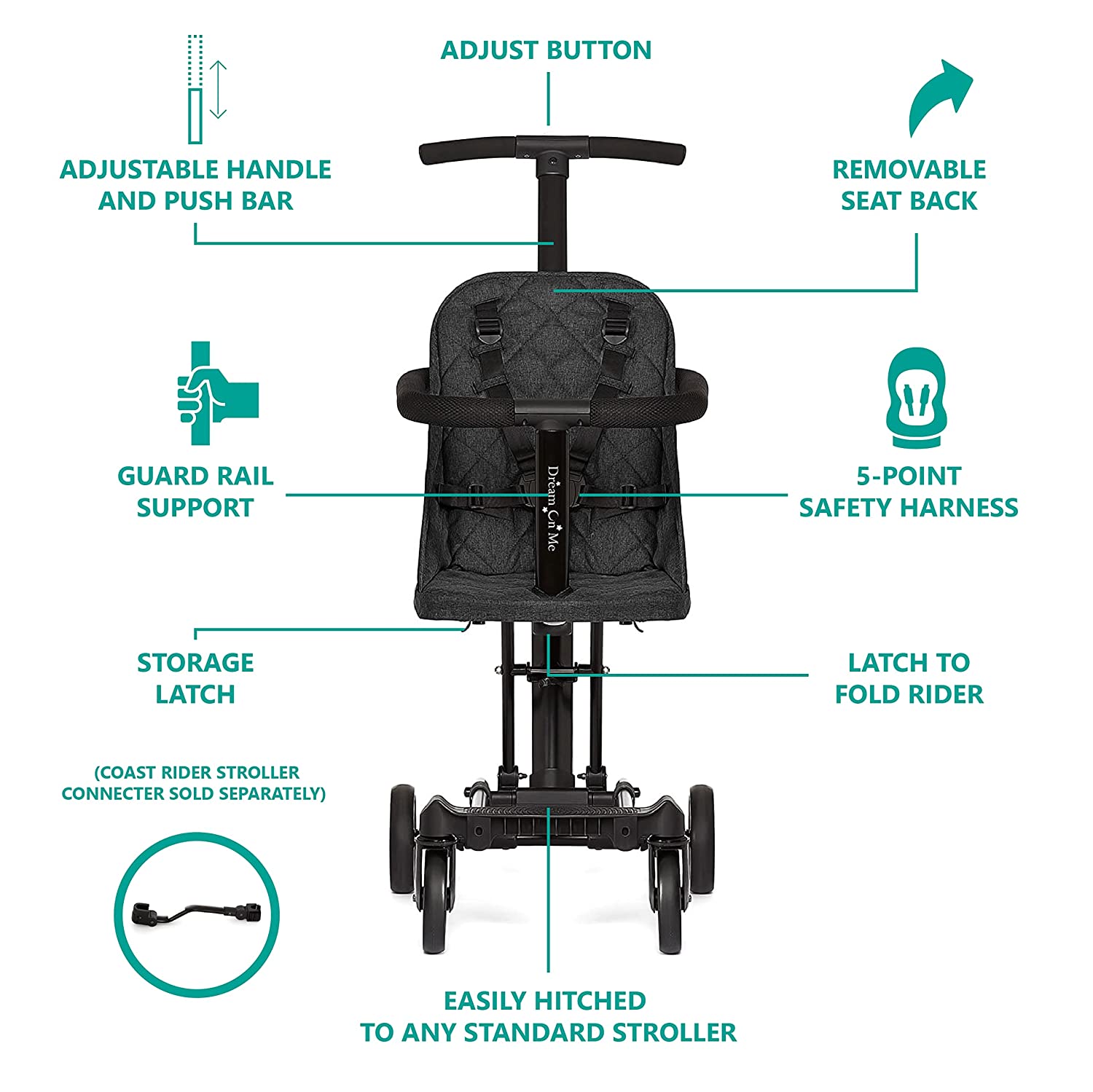 Imagine all of the perks that come with having a traditional stroller without the added bulk?! Experience the world with the JPMA Innovation Award Winner & theme-park approved, Dream On Me Coast Rider Stroller! Fondly known as the Disney (Park) stroller, this must-have checks all the boxes for baby AND parent. Lightweight at just 13.5 Lbs. yet equipped with a sturdy aluminium frame, the Coast Rider Stroller easily converts to a Scooter & Rider. The Soft-ride wheels for maneuverability, plush seating and 275-degree viewing put your child’s comfort at the forefront. This parent-loved Stroller boasts of a smooth one-hand fold feature that allows it to instantly fold inward like a book, high-quality waterproof fabric, adjustable handles & push bars. For days out in the sun or that family shopping run, combine the stroller with the Coast Rider Stroller Canopy and Coast Rider Connector (both sold separately) that turns it into a tandem travel-ready stroller in a snap! With family fun-time on the agenda, safety is our top priority. The Coast Rider Stroller comes with a 5-point safety harness and meets/exceeds all ASTM & CPSC Standards. It’s also the winner of the National Parenting Center Holiday 2019 Seal of Approval. Weight capacity: 45 Lbs. Dimensions: 28” L x 14” W x 37.5” H. Keep safety harness strapped on child at all times, do not hang diaper bags/purses on the handle bars.