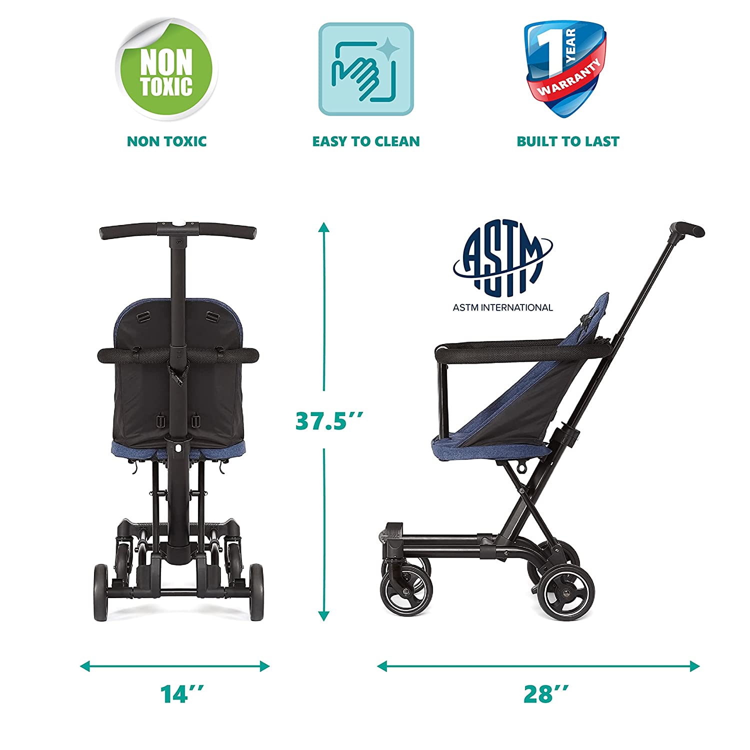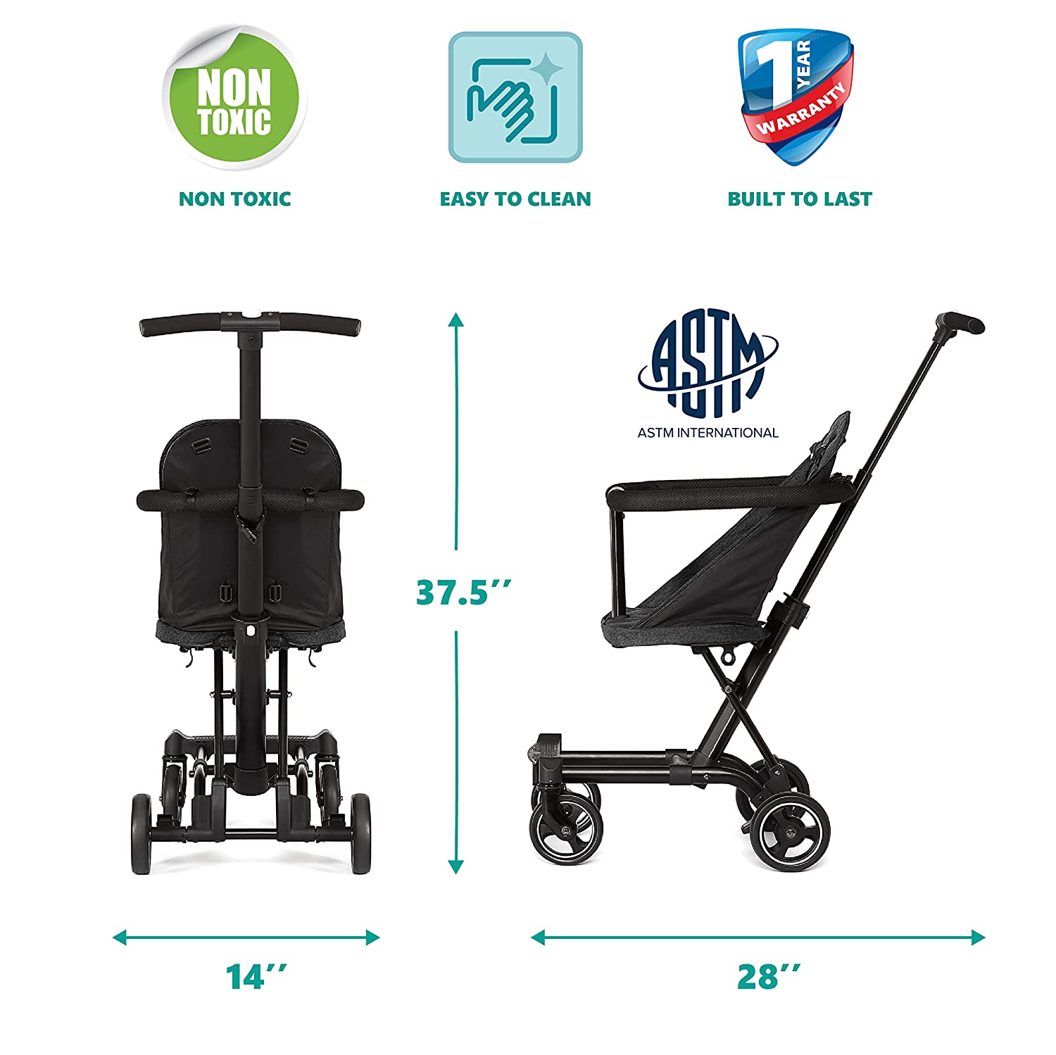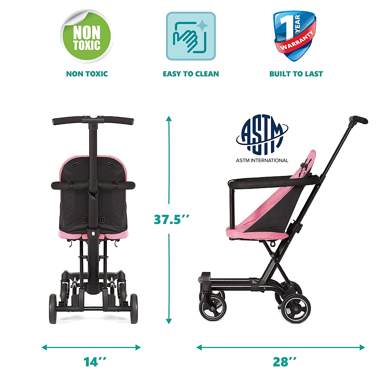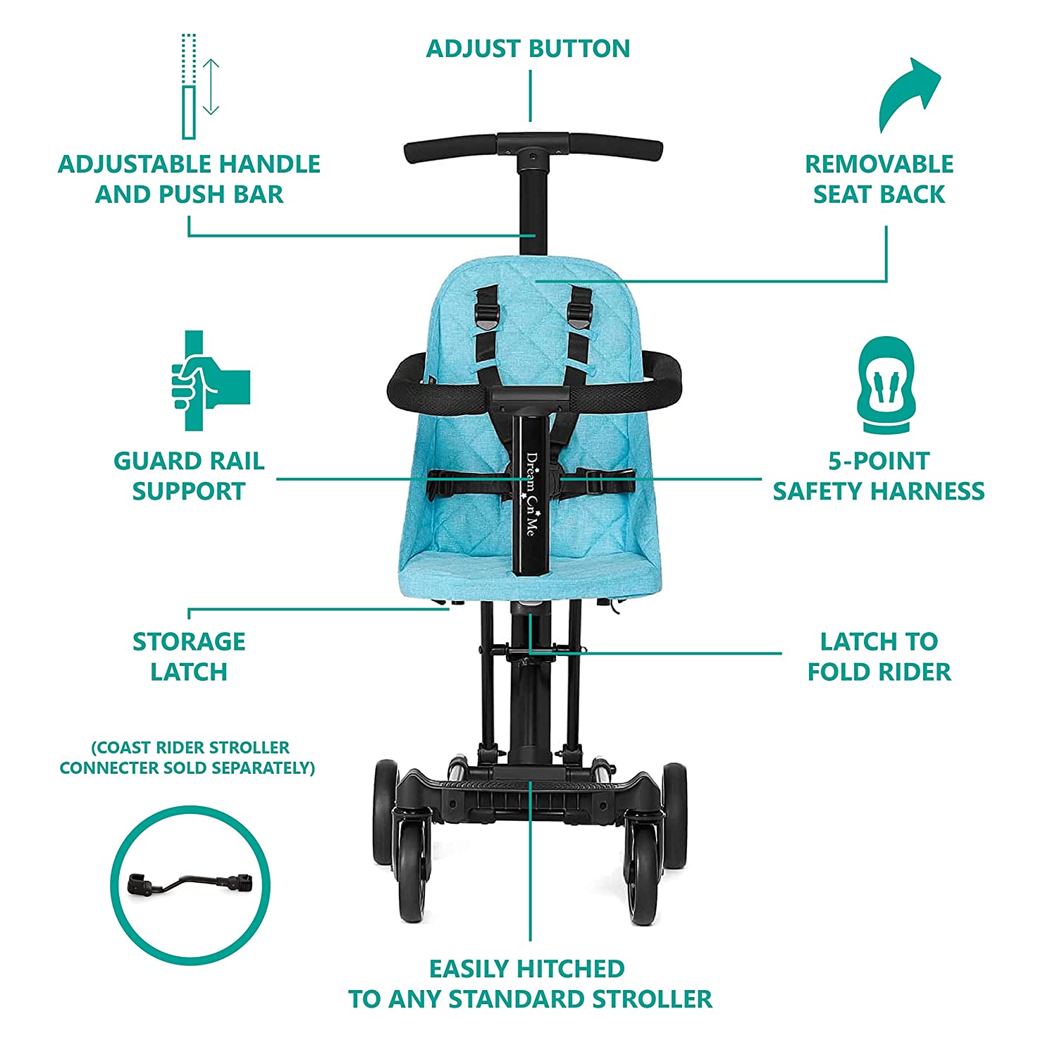 Imagine all of the perks that come with having a traditional stroller without the added bulk?! Experience the world with the JPMA Innovation Award Winner & theme-park approved, Dream On Me Coast Rider Stroller! Fondly known as the Disney (Park) stroller, this must-have checks all the boxes for baby AND parent. Lightweight at just 13.5 Lbs. yet equipped with a sturdy aluminium frame, the Coast Rider Stroller easily converts to a Scooter & Rider. The Soft-ride wheels for maneuverability, plush seating and 275-degree viewing put your child’s comfort at the forefront. This parent-loved Stroller boasts of a smooth one-hand fold feature that allows it to instantly fold inward like a book, high-quality waterproof fabric, adjustable handles & push bars. For days out in the sun or that family shopping run, combine the stroller with the Coast Rider Stroller Canopy and Coast Rider Connector (both sold separately) that turns it into a tandem travel-ready stroller in a snap! With family fun-time on the agenda, safety is our top priority. The Coast Rider Stroller comes with a 5-point safety harness and meets/exceeds all ASTM & CPSC Standards. It’s also the winner of the National Parenting Center Holiday 2019 Seal of Approval. Weight capacity: 45 Lbs. Dimensions: 28” L x 14” W x 37.5” H. Keep safety harness strapped on child at all times, do not hang diaper bags/purses on the handle bars.