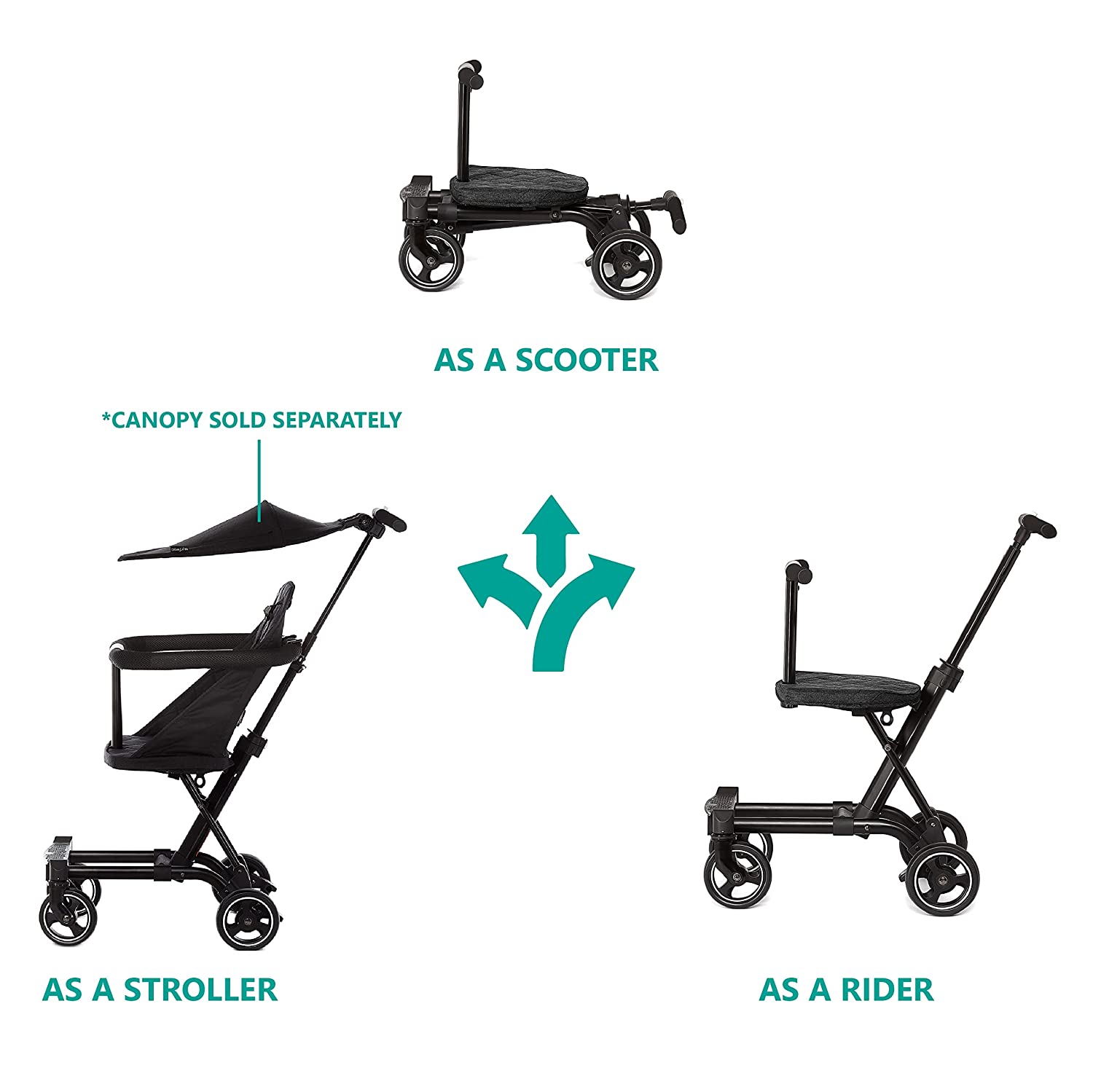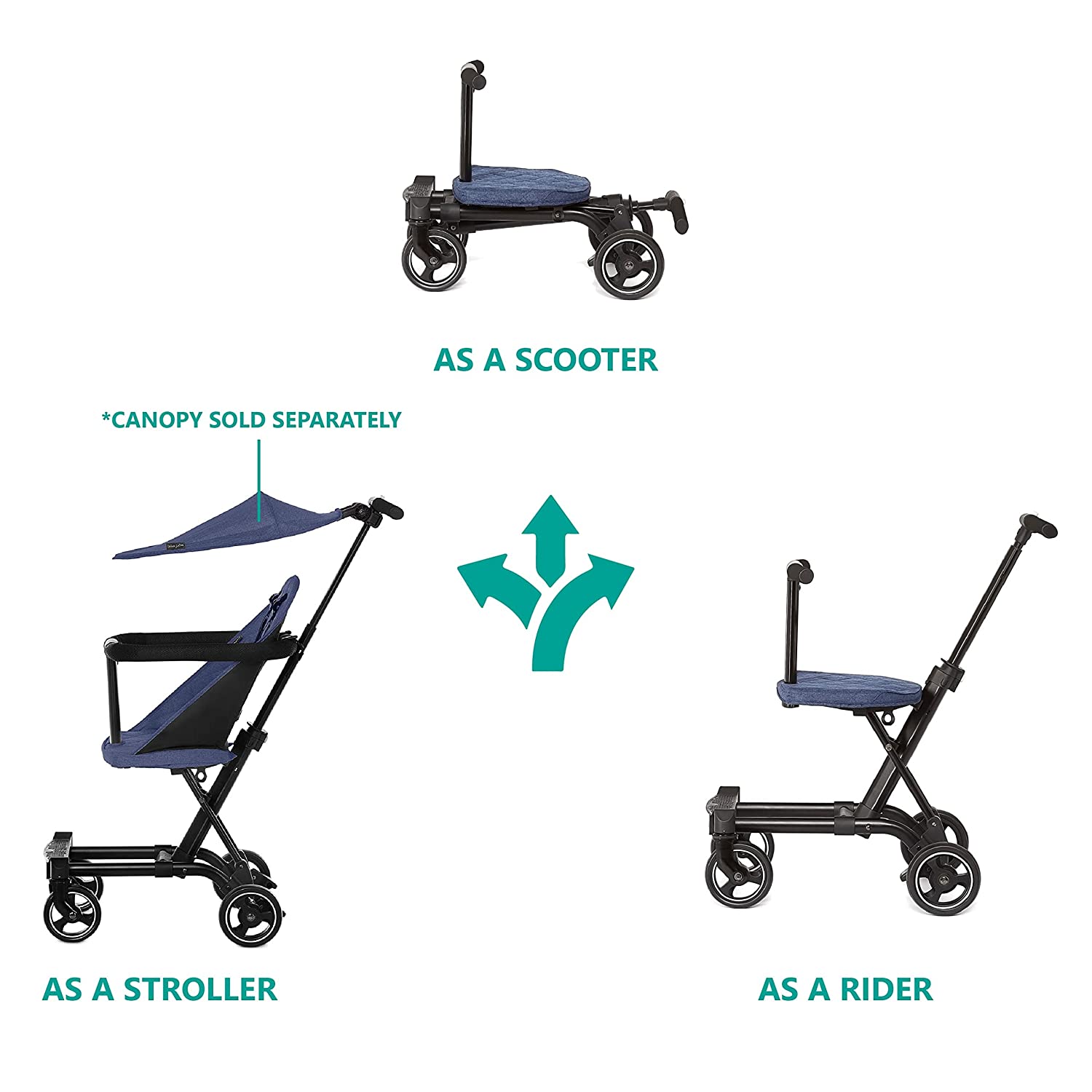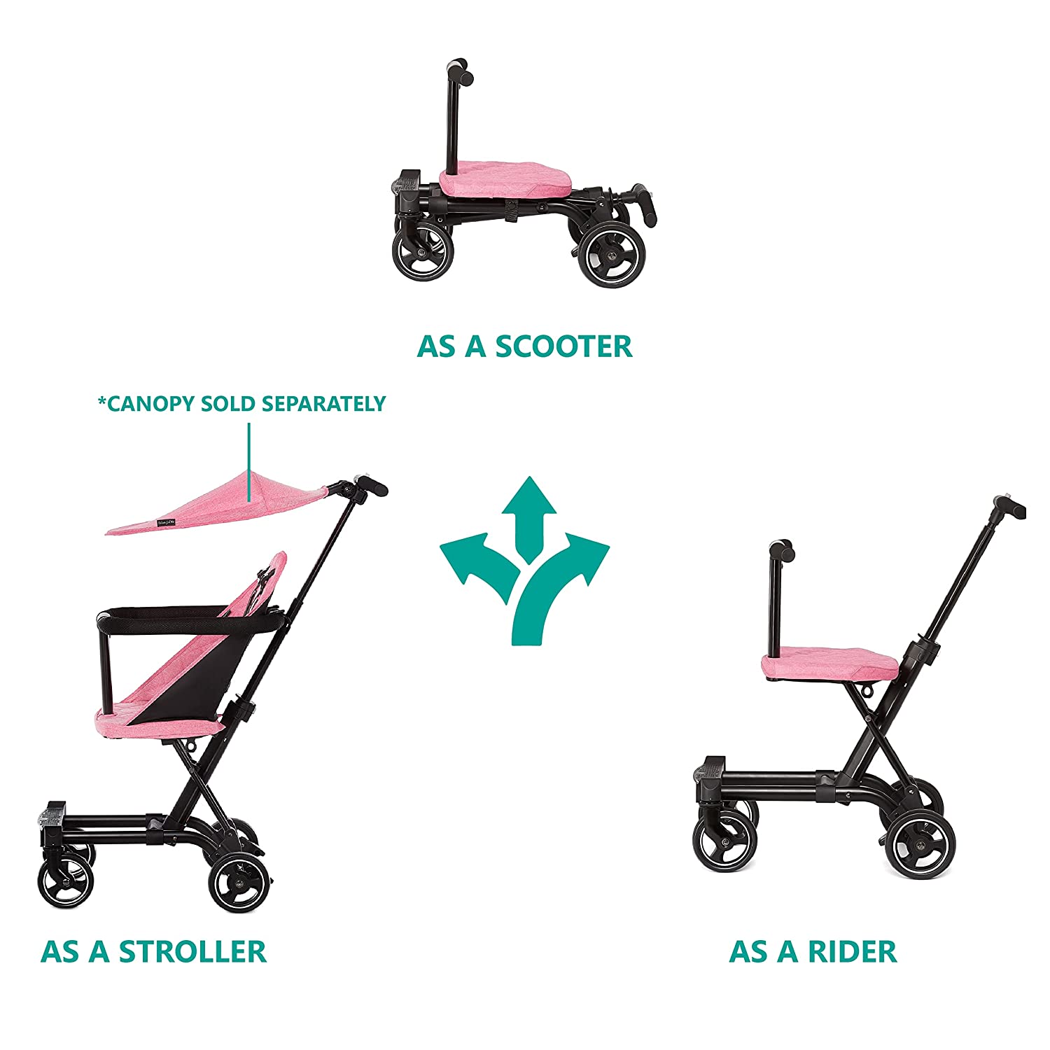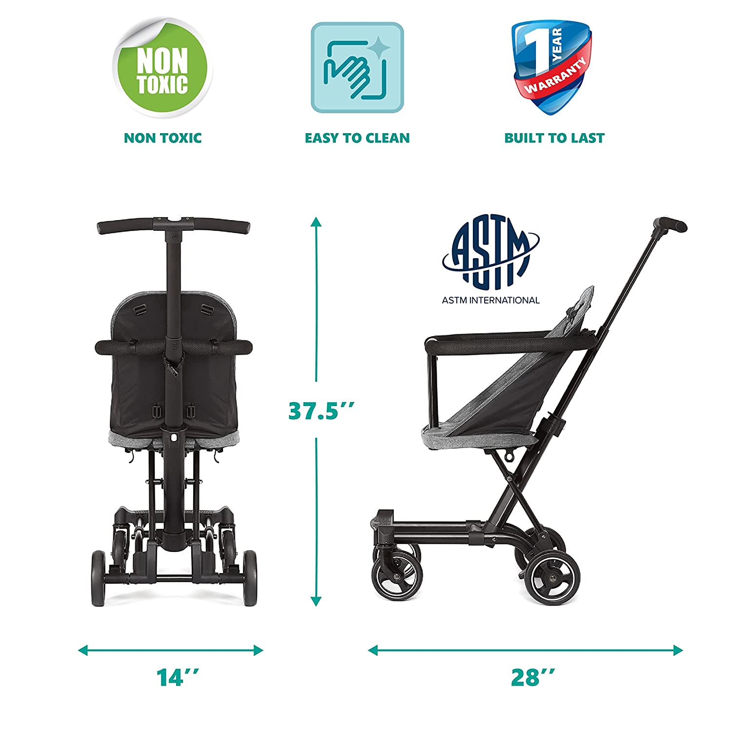 Imagine all of the perks that come with having a traditional stroller without the added bulk?! Experience the world with the JPMA Innovation Award Winner & theme-park approved, Dream On Me Coast Rider Stroller! Fondly known as the Disney (Park) stroller, this must-have checks all the boxes for baby AND parent. Lightweight at just 13.5 Lbs. yet equipped with a sturdy aluminium frame, the Coast Rider Stroller easily converts to a Scooter & Rider. The Soft-ride wheels for maneuverability, plush seating and 275-degree viewing put your child’s comfort at the forefront. This parent-loved Stroller boasts of a smooth one-hand fold feature that allows it to instantly fold inward like a book, high-quality waterproof fabric, adjustable handles & push bars. For days out in the sun or that family shopping run, combine the stroller with the Coast Rider Stroller Canopy and Coast Rider Connector (both sold separately) that turns it into a tandem travel-ready stroller in a snap! With family fun-time on the agenda, safety is our top priority. The Coast Rider Stroller comes with a 5-point safety harness and meets/exceeds all ASTM & CPSC Standards. It’s also the winner of the National Parenting Center Holiday 2019 Seal of Approval. Weight capacity: 45 Lbs. Dimensions: 28” L x 14” W x 37.5” H. Keep safety harness strapped on child at all times, do not hang diaper bags/purses on the handle bars.