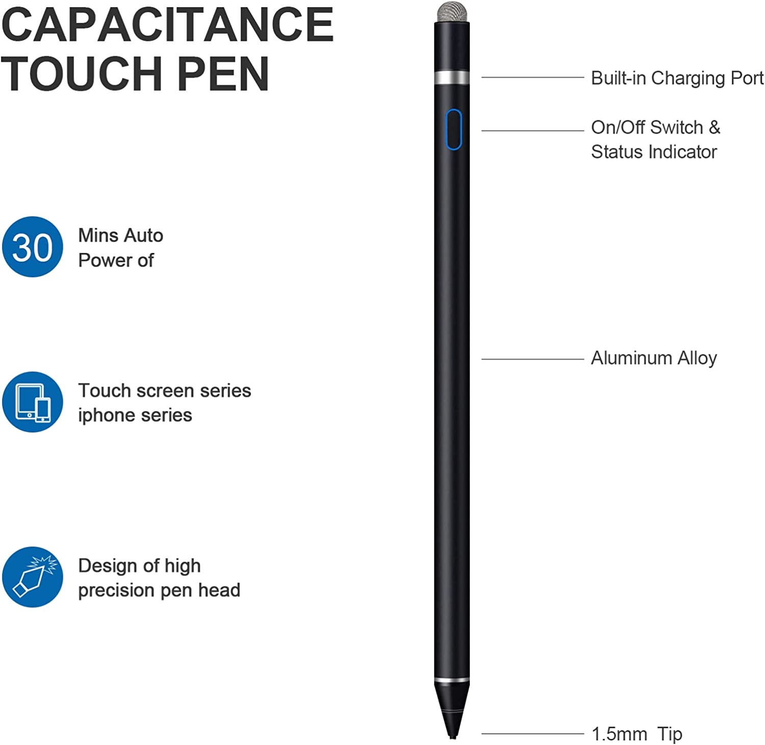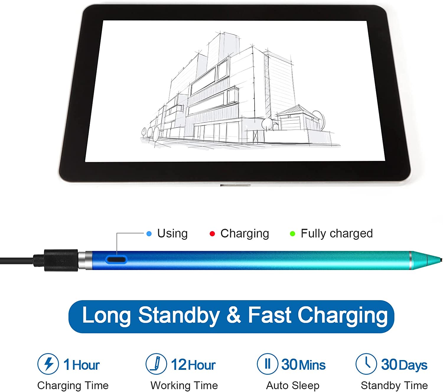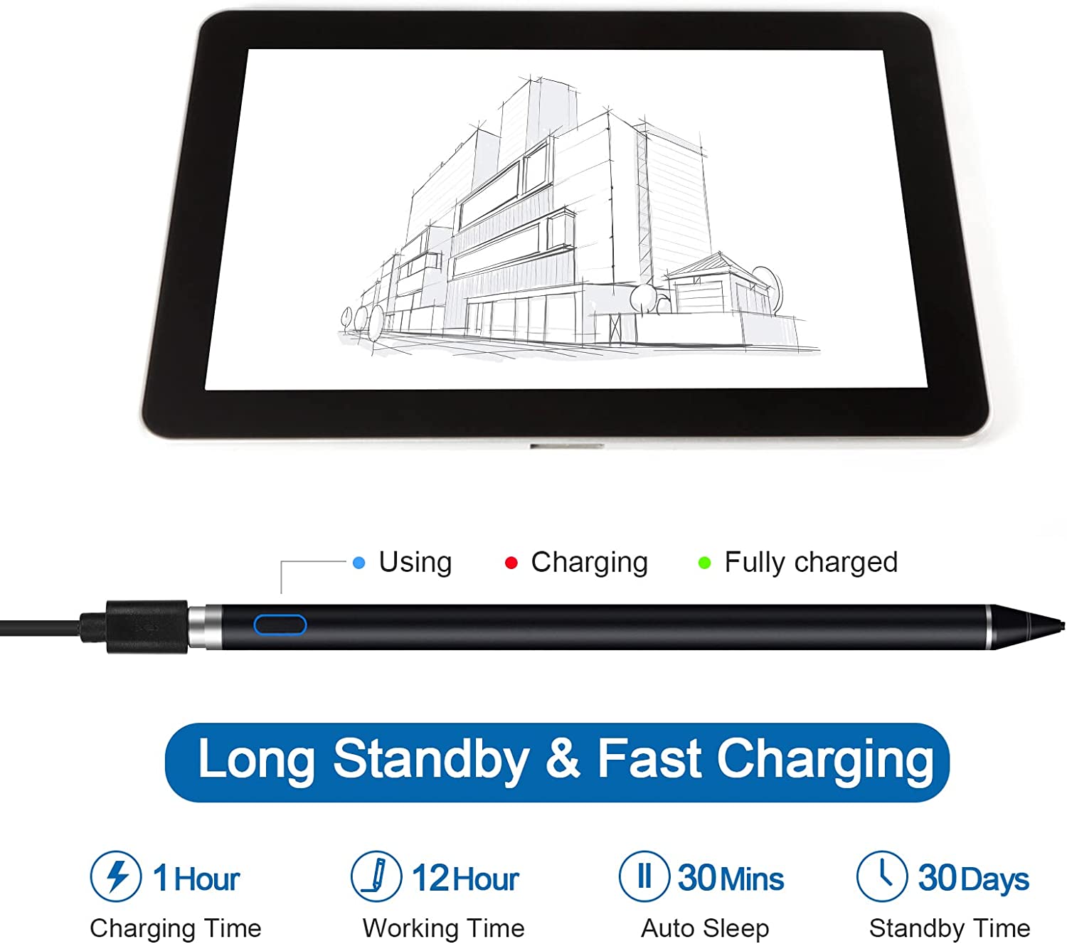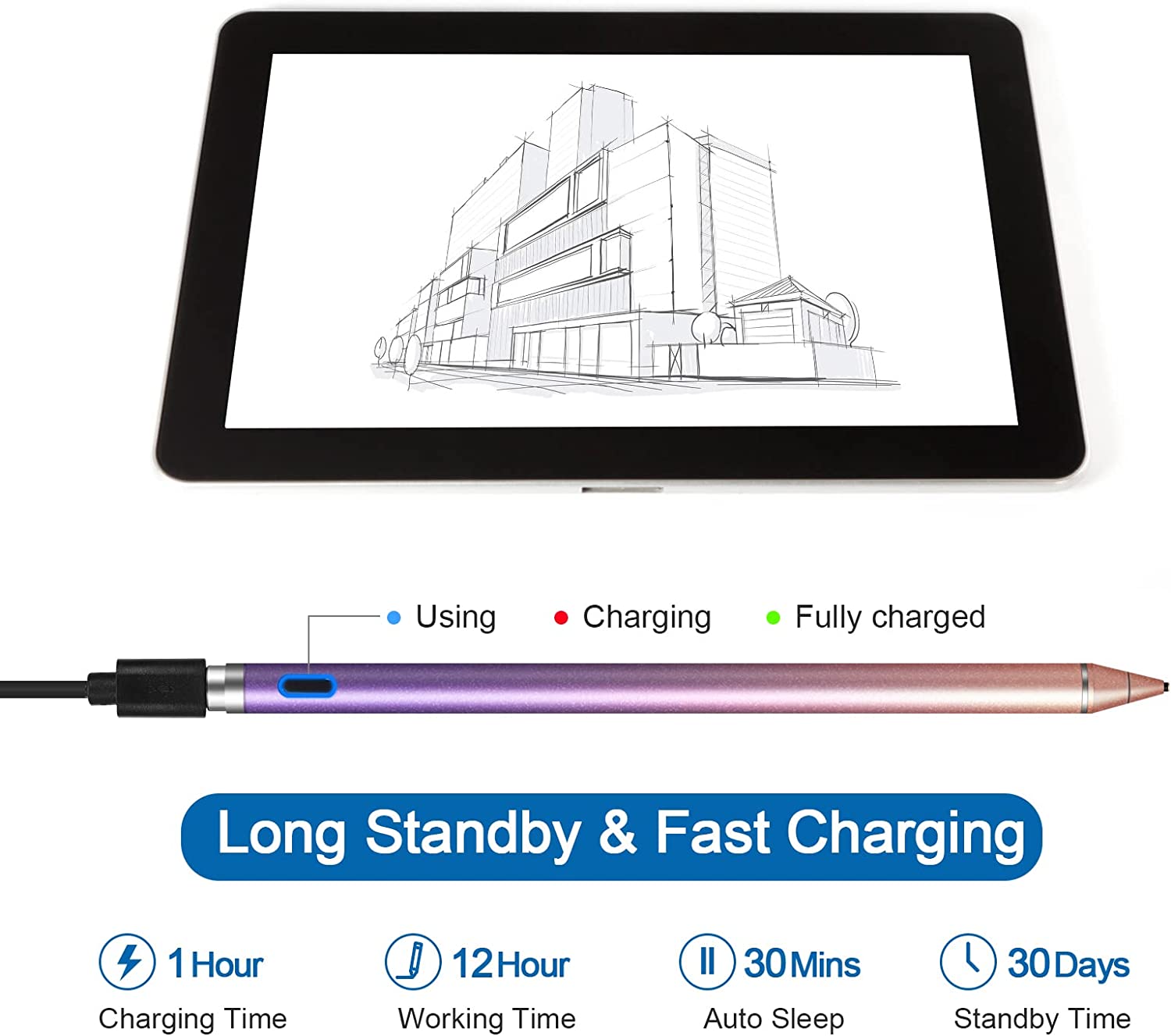 • Fast Charging & Long Lasting Battery- The stylus pen has a built-in battery which provides 12 hours active use while it's fully charged with micro USB cable in 60 minutes. It will automatically shut down after 30 mins for battery protection.