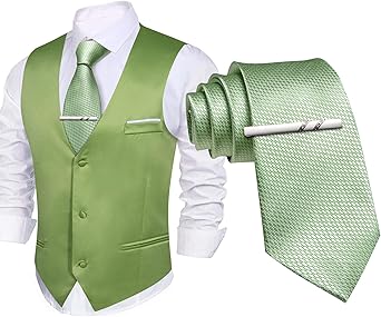 Barry.Wang Men's Light Green Necktie Clip Business Suit Vest Slim Fit Solid Satin Wedding Dress Waistcoat for V-Neck Tuxedo Waistcoat