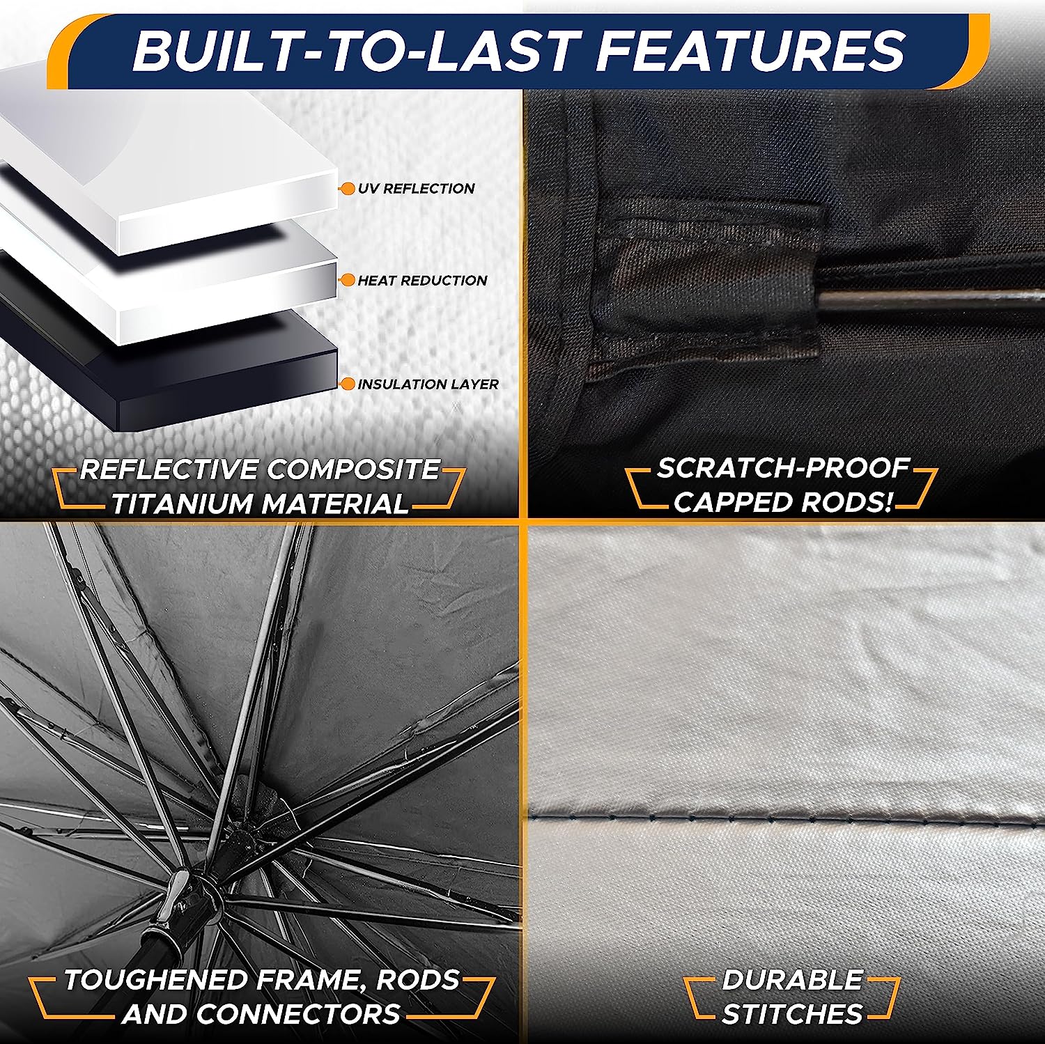 • Designed for Longevity: Our Car Window Covers feature Titanium Silver Glue Coating with Composite Polyester, providing tremendous protection against the sun's heat! Our shades are made from ten-stable toughened steel rods, ensuring superior durability!