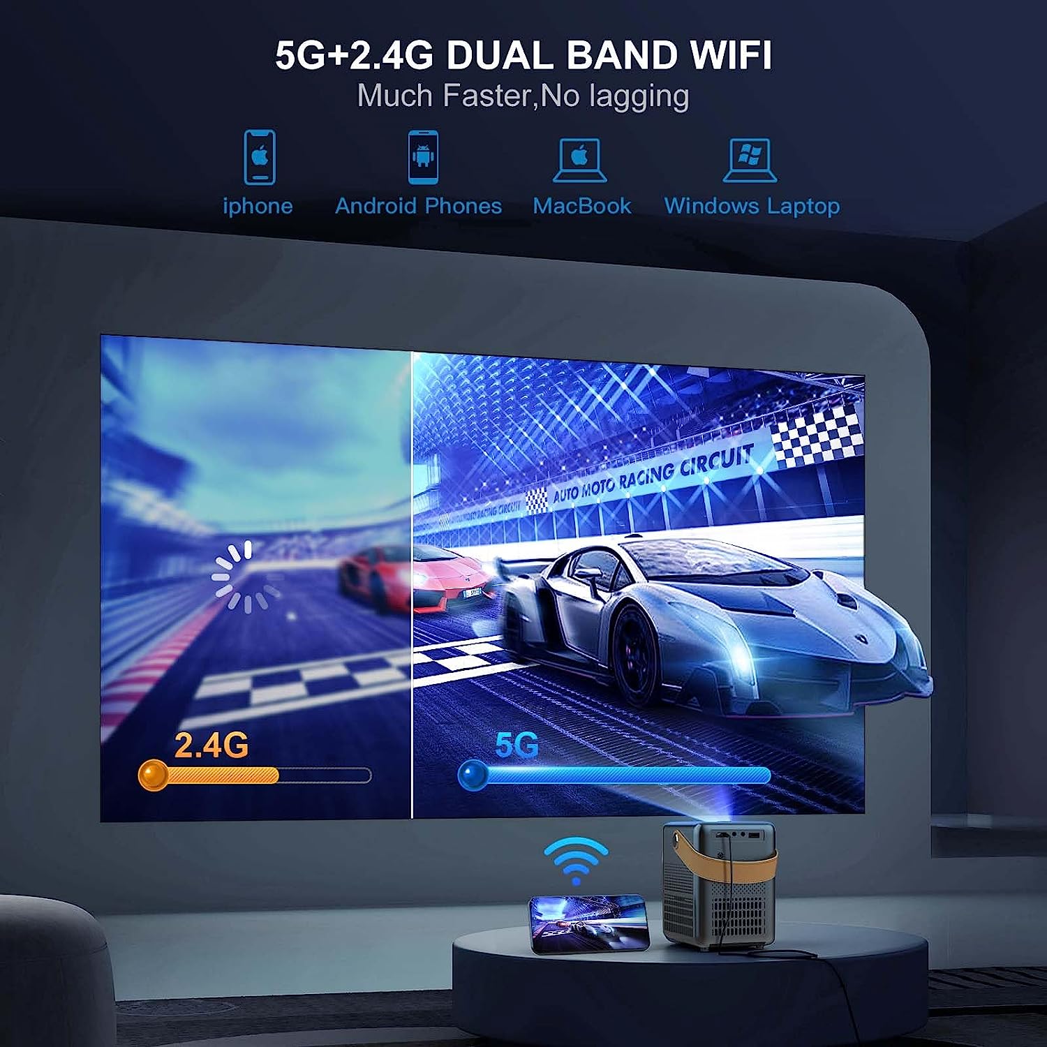 • 🎁【Ultra-fast 5G WiFi & Bluetooth 5.2】P61 WiFi Bluetooth projector provides 5G/2.4G dual-band WiFi connections. which can effectively avoid signal interference, ensure a stable signal and fast transmission speed, offers much smoother and lag free online video streaming experience.While P61 Bluetooth projector adopts the latest Bluetooth 5.2 chip,which supports stable connection to various Bluetooth speakers/bluetooth earphones/airpots, bringing you more shocking and immersive sound.