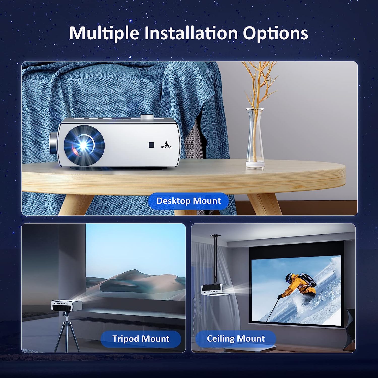 • 【Best Projection & Remote Control】NexiGo PJ10 the projector provides a watching size from 42.5 inches to 176 inches with a projection distance between 4.3ft to 16.4ft. supports the placement of a tripod and ceiling mount front/rear projection without taking up too much space, It's very convenient to adjust the screen by using the remote control. (Note: 2 x AAA batteries are NOT included in the package with remote control.)