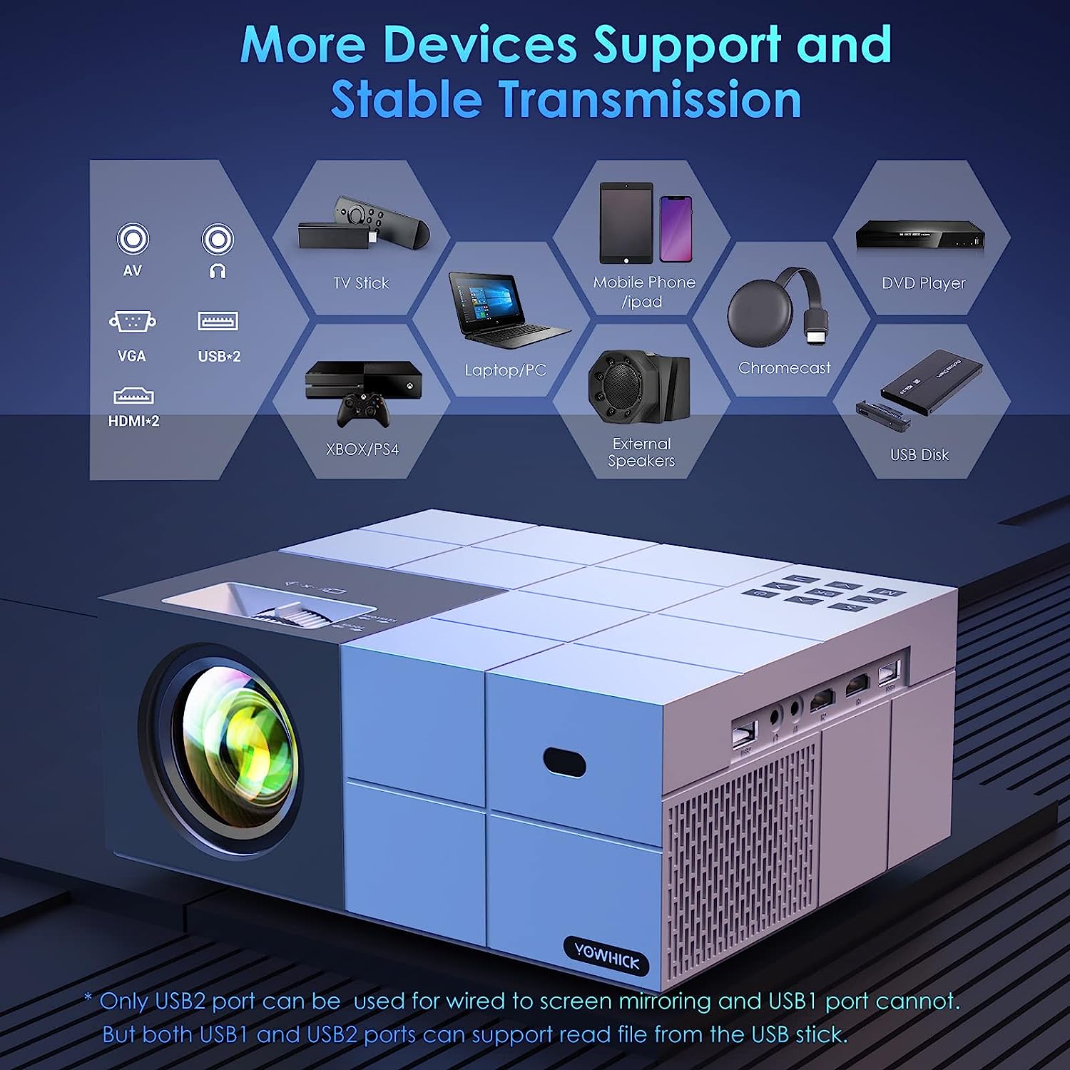 • 【Multiple Devices Compatibled】This outdoor projector built in HDMI/USB/VGA/AV/Audio ports, makes it easier to connect TV sticks, USB Disk, PCs, laptop, MacBooks, iOS&Andriod Phone, DVD player, PS5, Game consoles, External Speaker, all YOWHICK projectors come with 2 year warranty, lifetime technical support and 24/7 hour professional customer service.