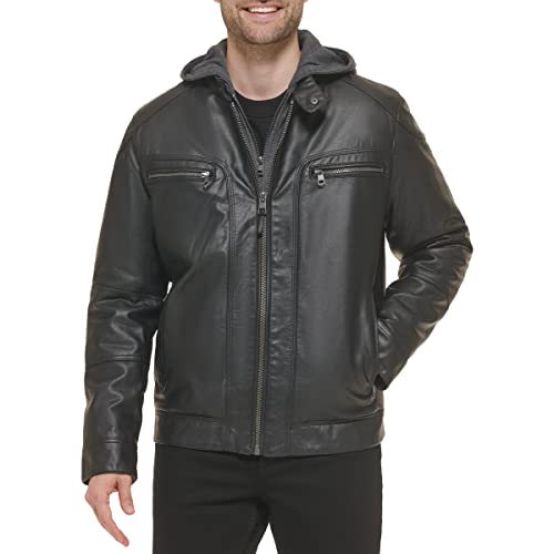 Details: Featuring a hooded sweater lining with zipper entry and mock neck design, this Calvin Klein faux leather jacket brings a stylish, confident look to any wardrobe. The hooded jacket offers four exterior pockets.