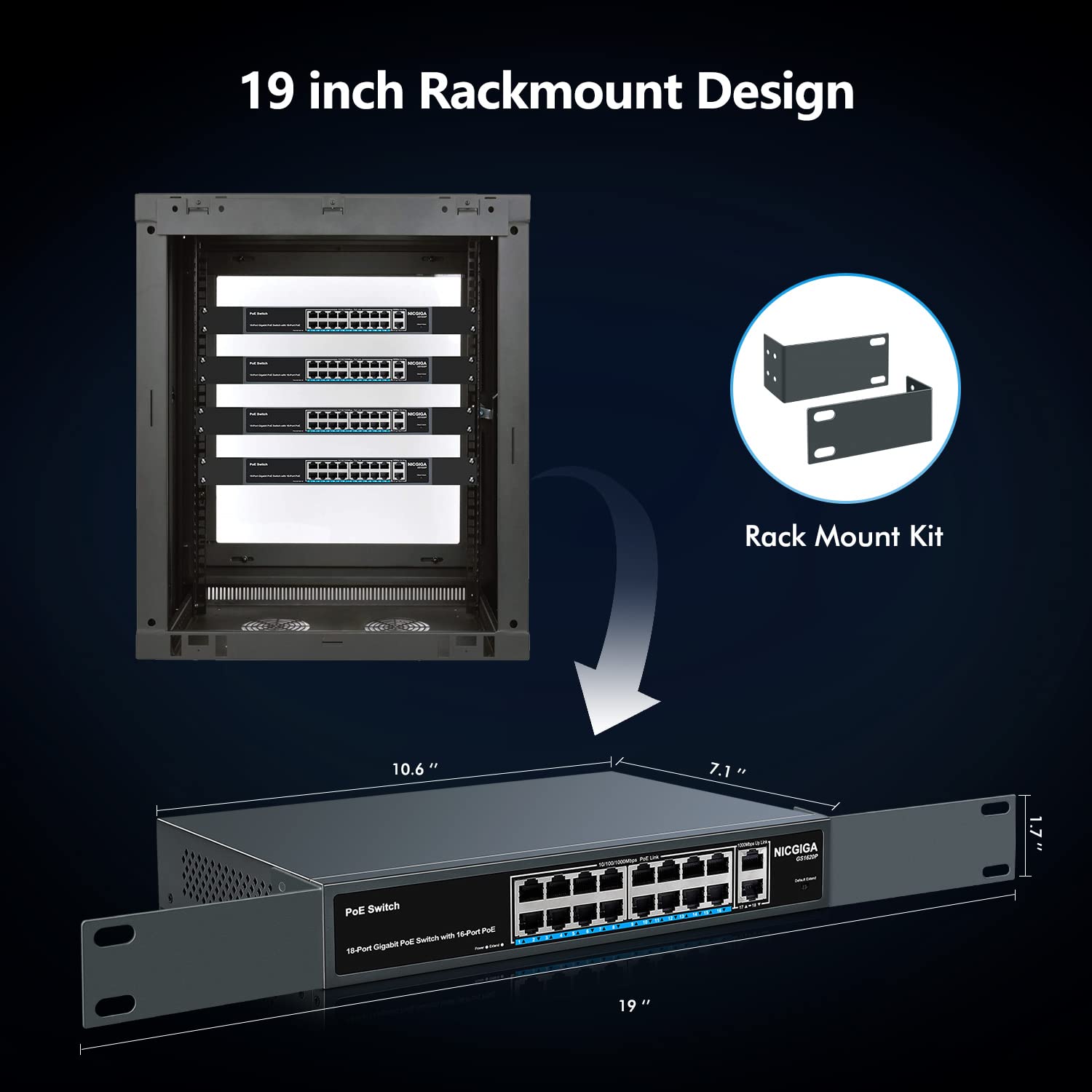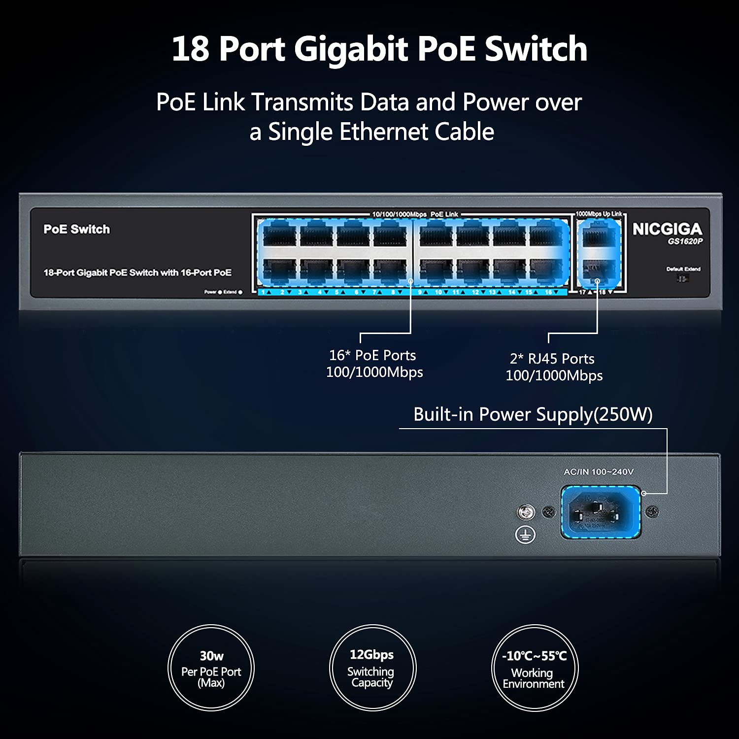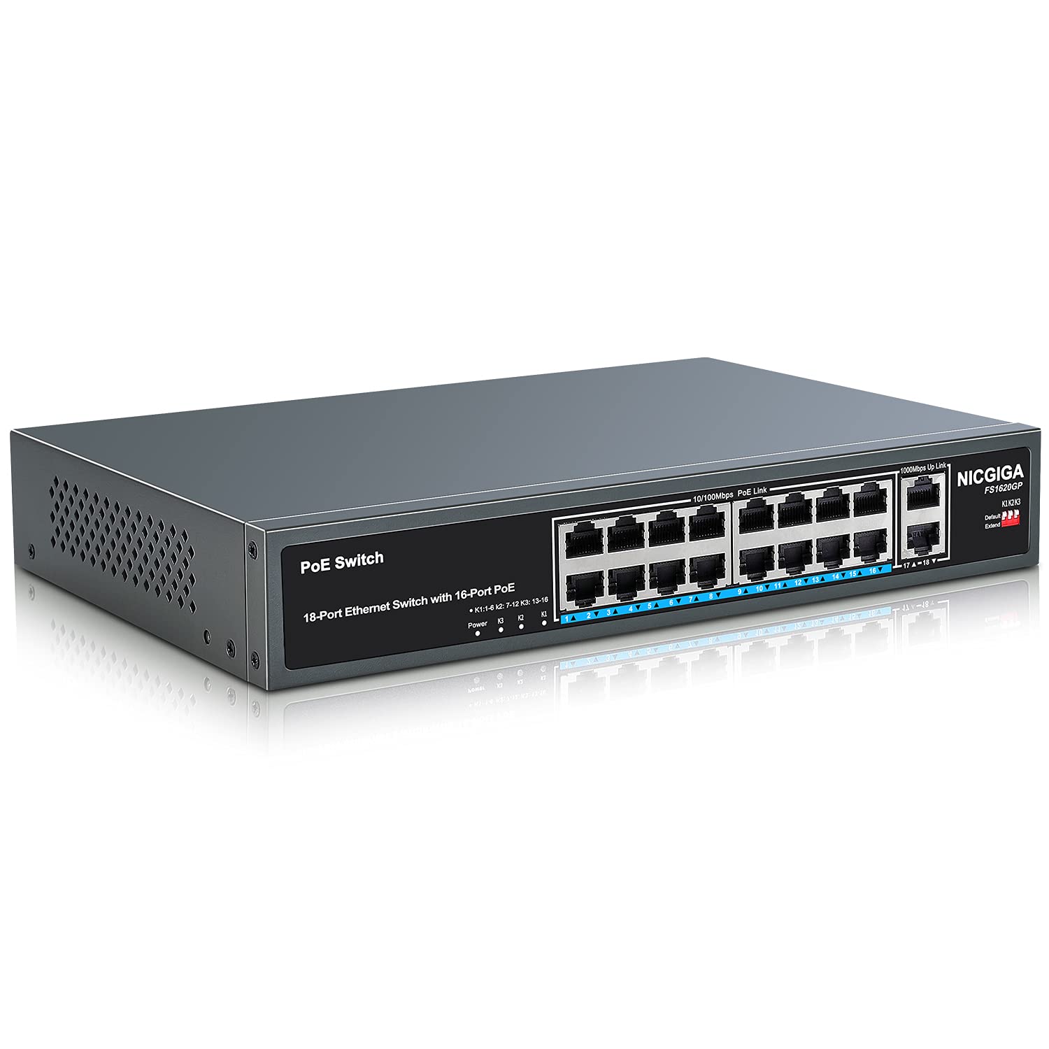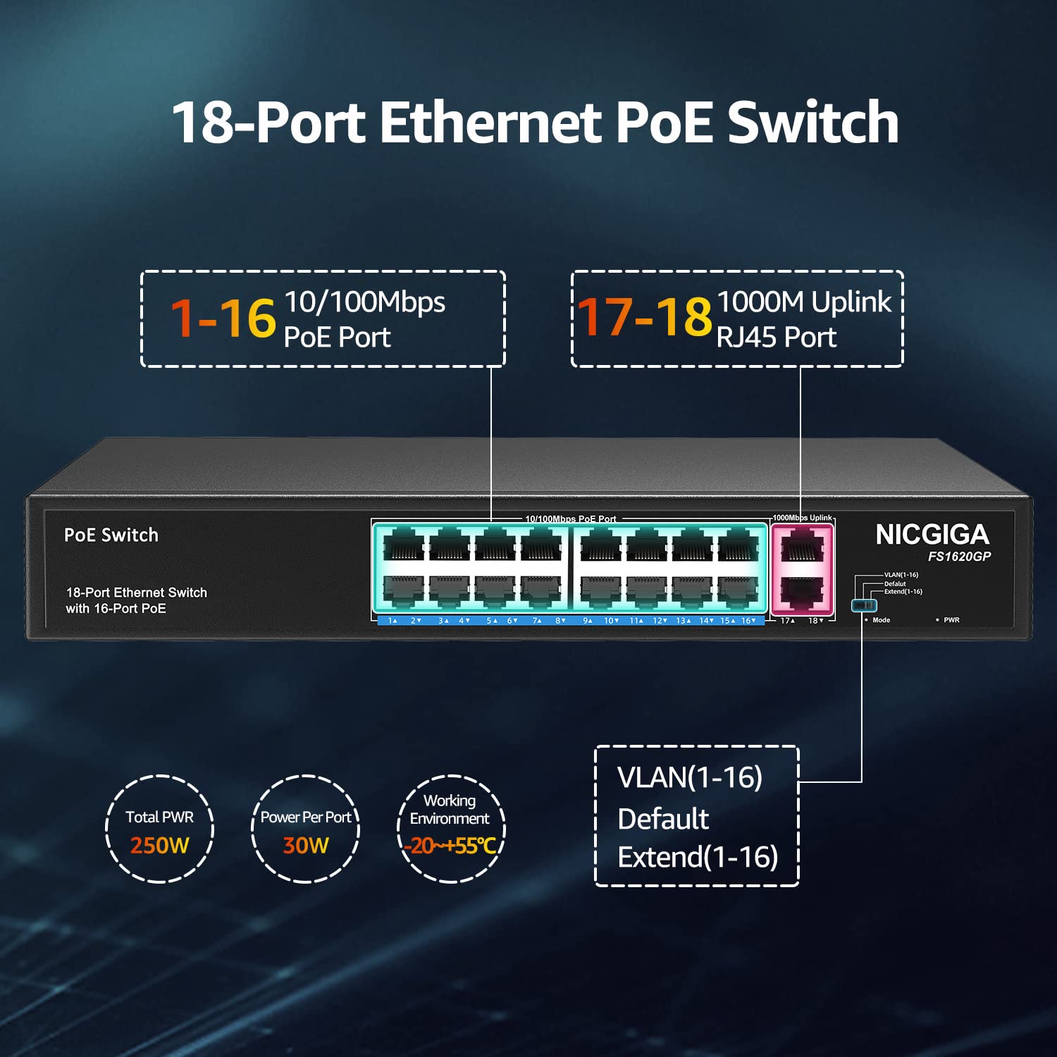 16 Port PoE Switch@250W with 2 Gigabit Uplink Port, NICGIGA 18 Port Ethernet PoE Switch, VLAN Mode, Extend to 250m, Sturdy Metal Case, 19 inch RackMount, Plug and Play, Unmanaged