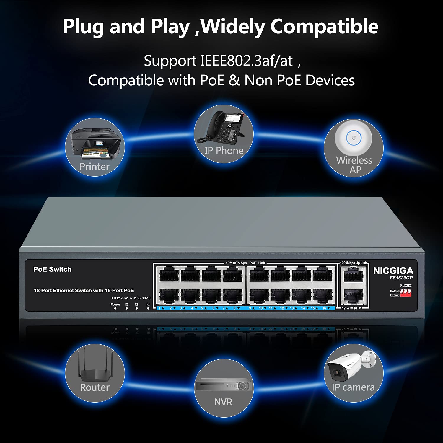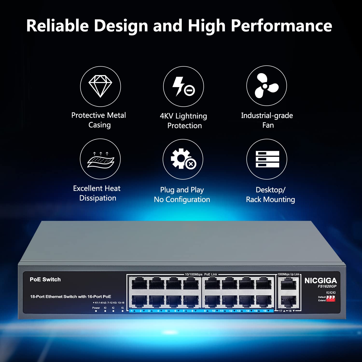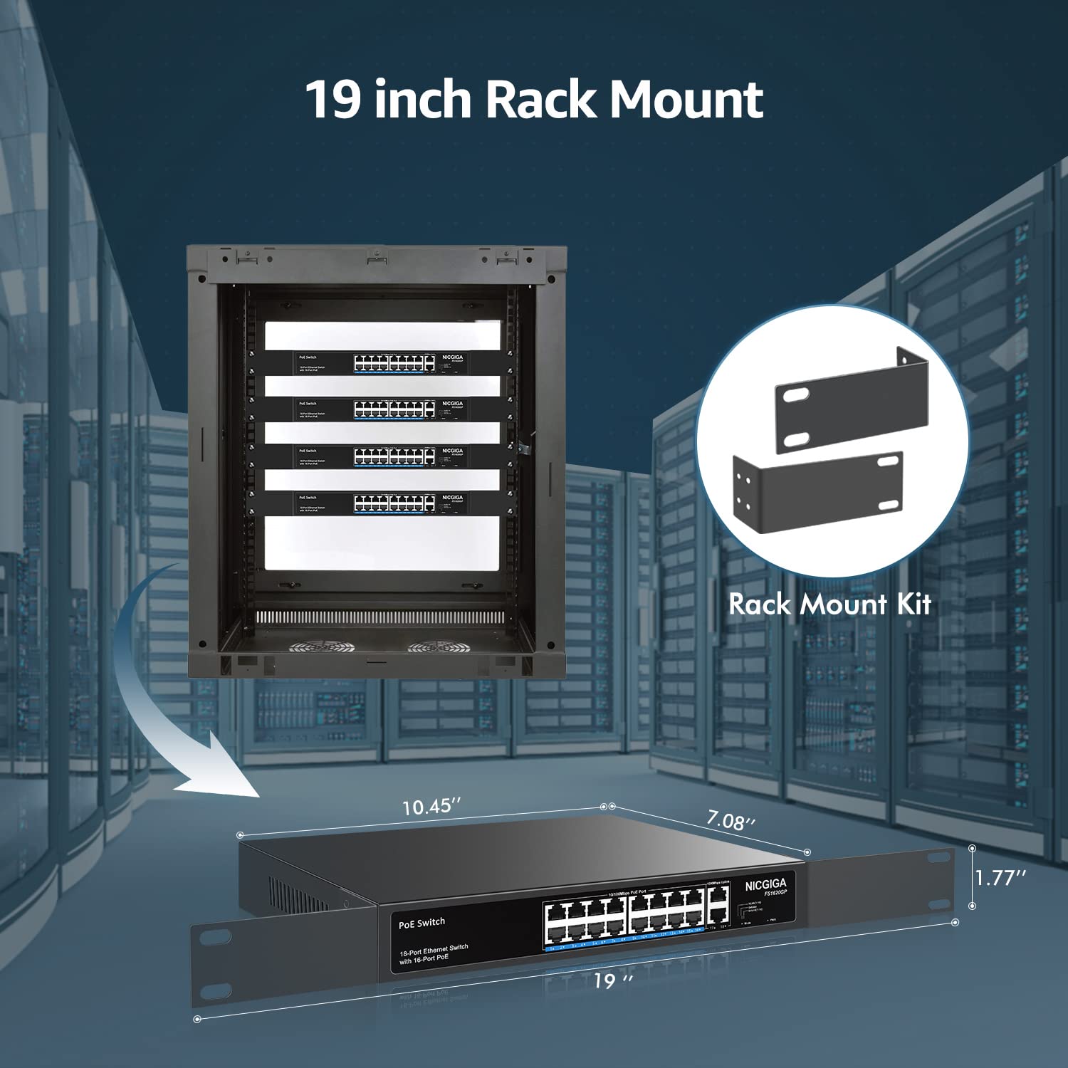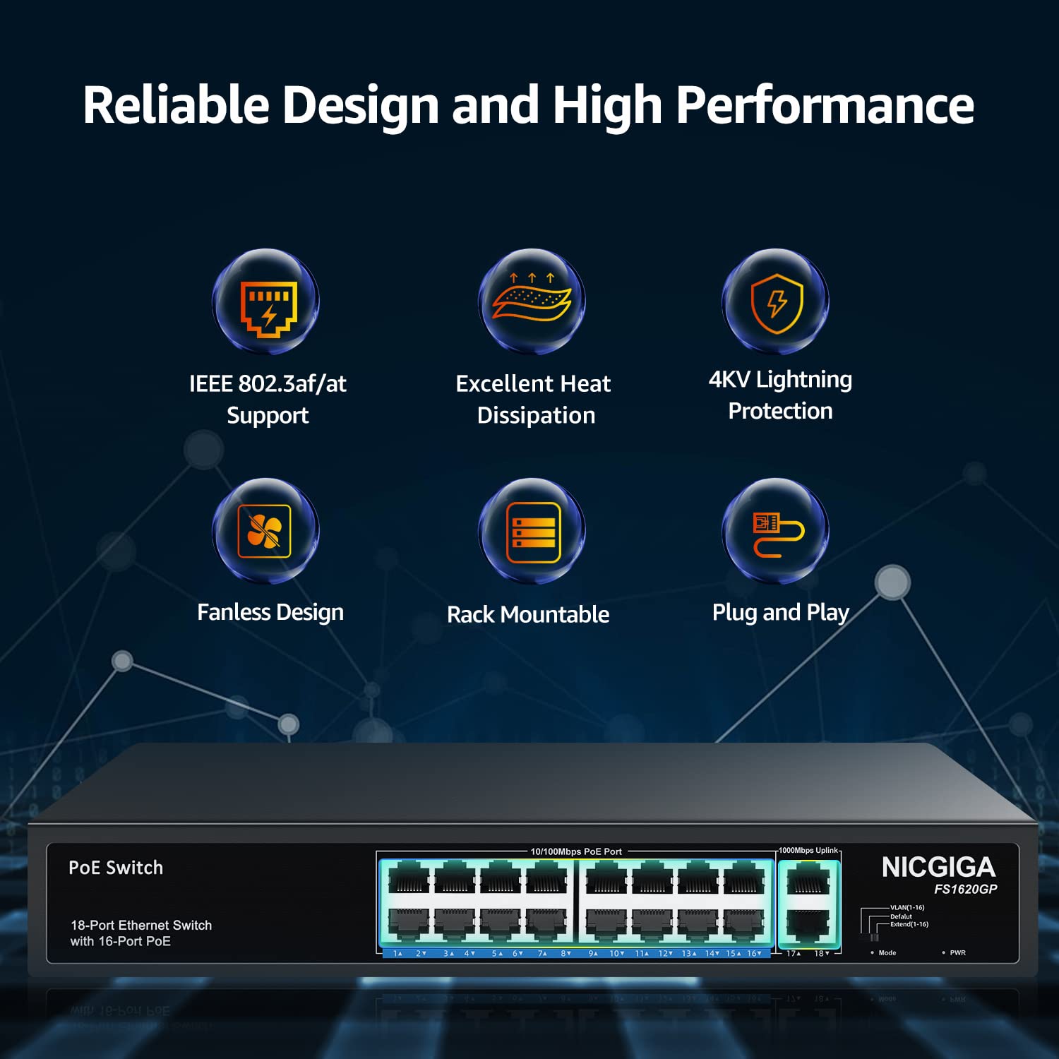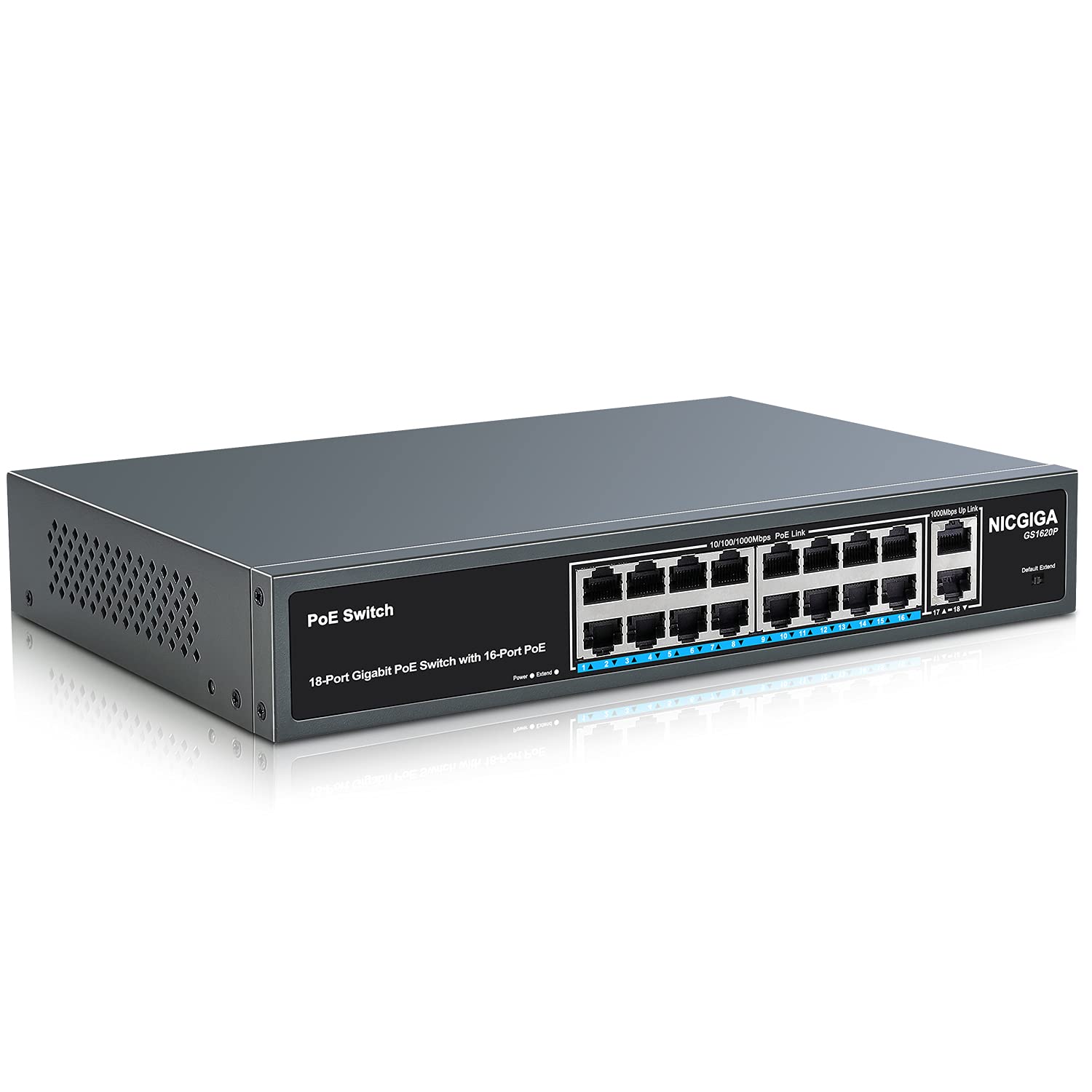 16 Port PoE Switch@250W with 2 Gigabit Uplink Port, NICGIGA 18 Port Ethernet PoE Switch, VLAN Mode, Extend to 250m, Sturdy Metal Case, 19 inch RackMount, Plug and Play, Unmanaged