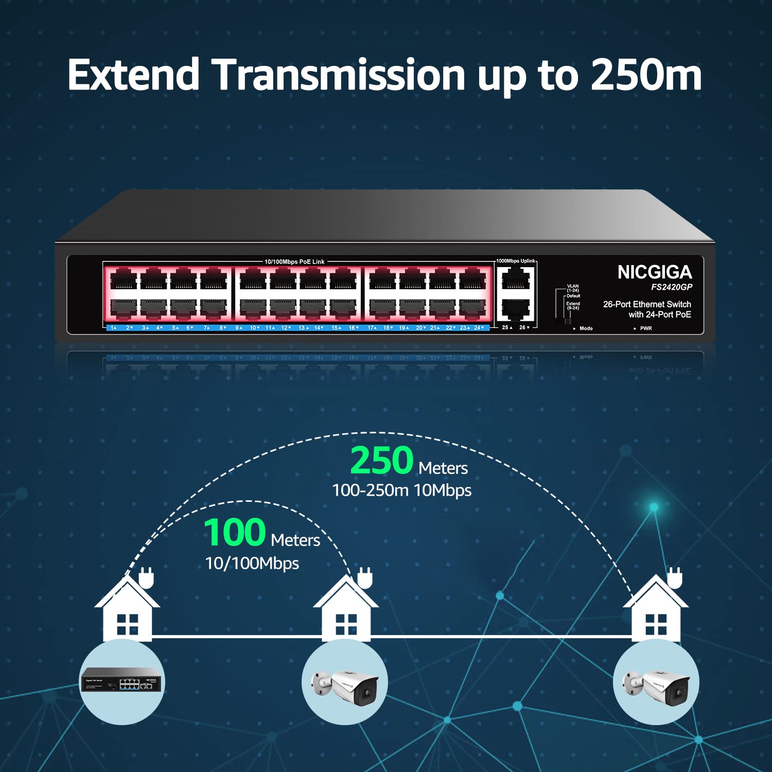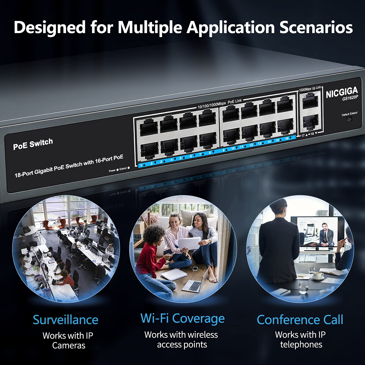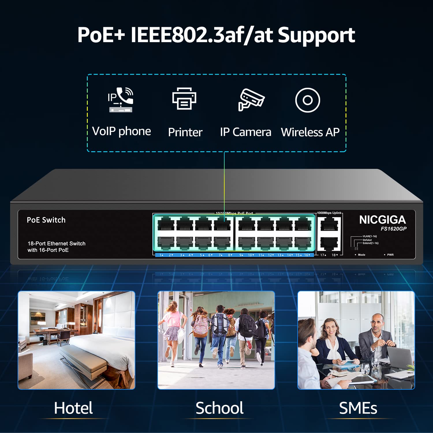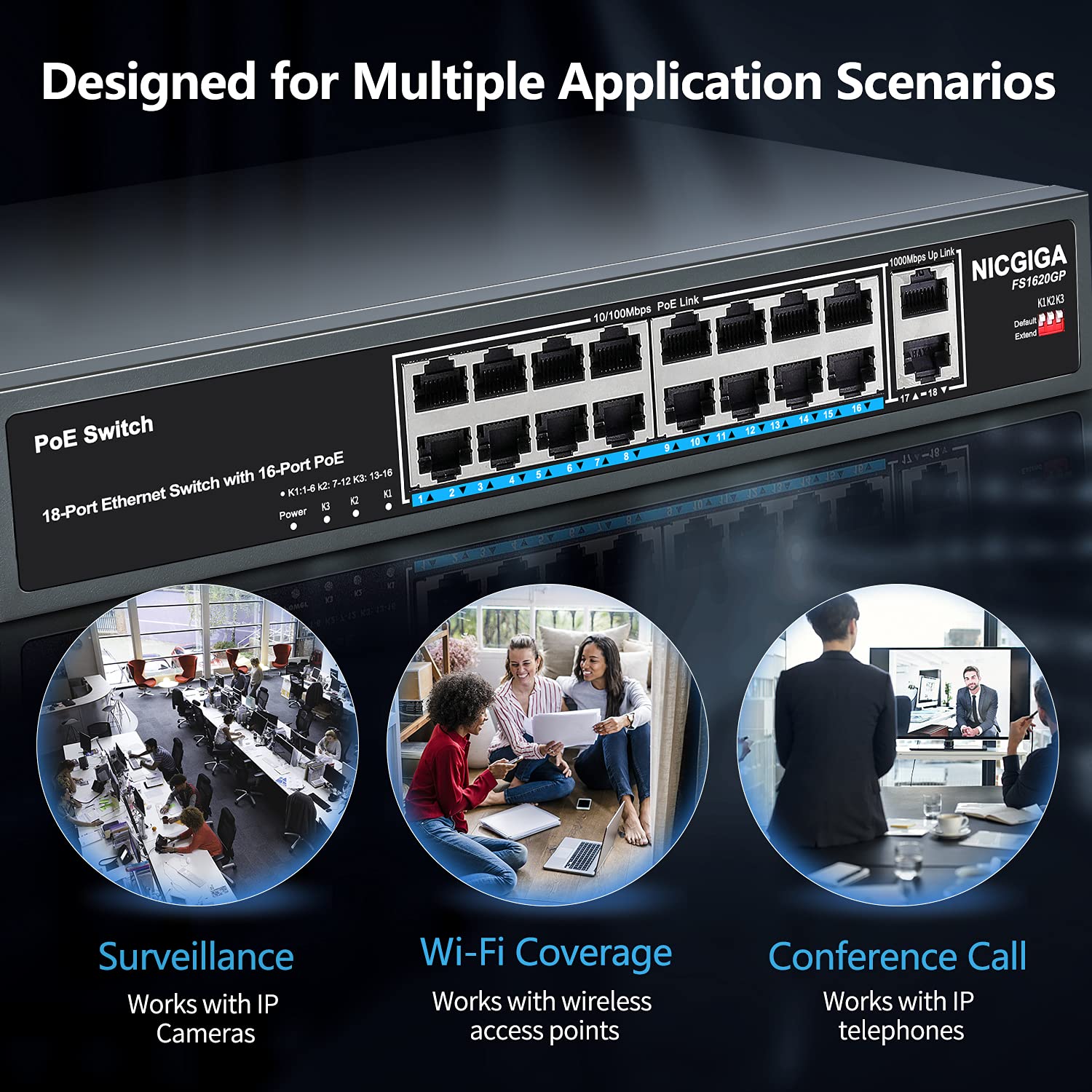 16 Port PoE Switch@250W with 2 Gigabit Uplink Port, NICGIGA 18 Port Ethernet PoE Switch, VLAN Mode, Extend to 250m, Sturdy Metal Case, 19 inch RackMount, Plug and Play, Unmanaged