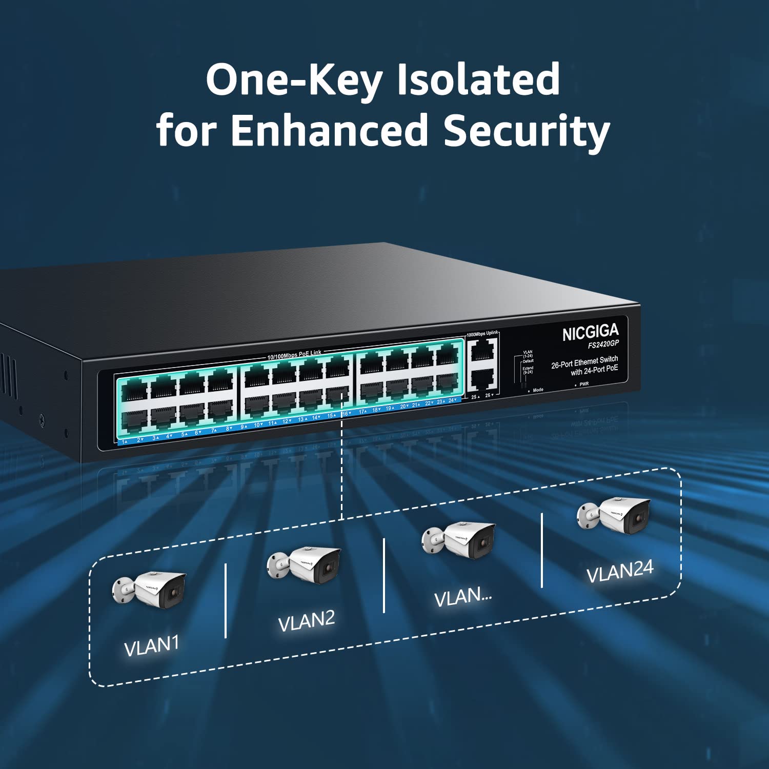 • VLAN switch, PoE ports will be isolated respectively but can communicate with uplink port,Better Network Bandwidth, 250m Extended Distance and Higher Security. Ideal for PoE IP Camera, EAP, Access Point, IP Phone and other PD devices.
