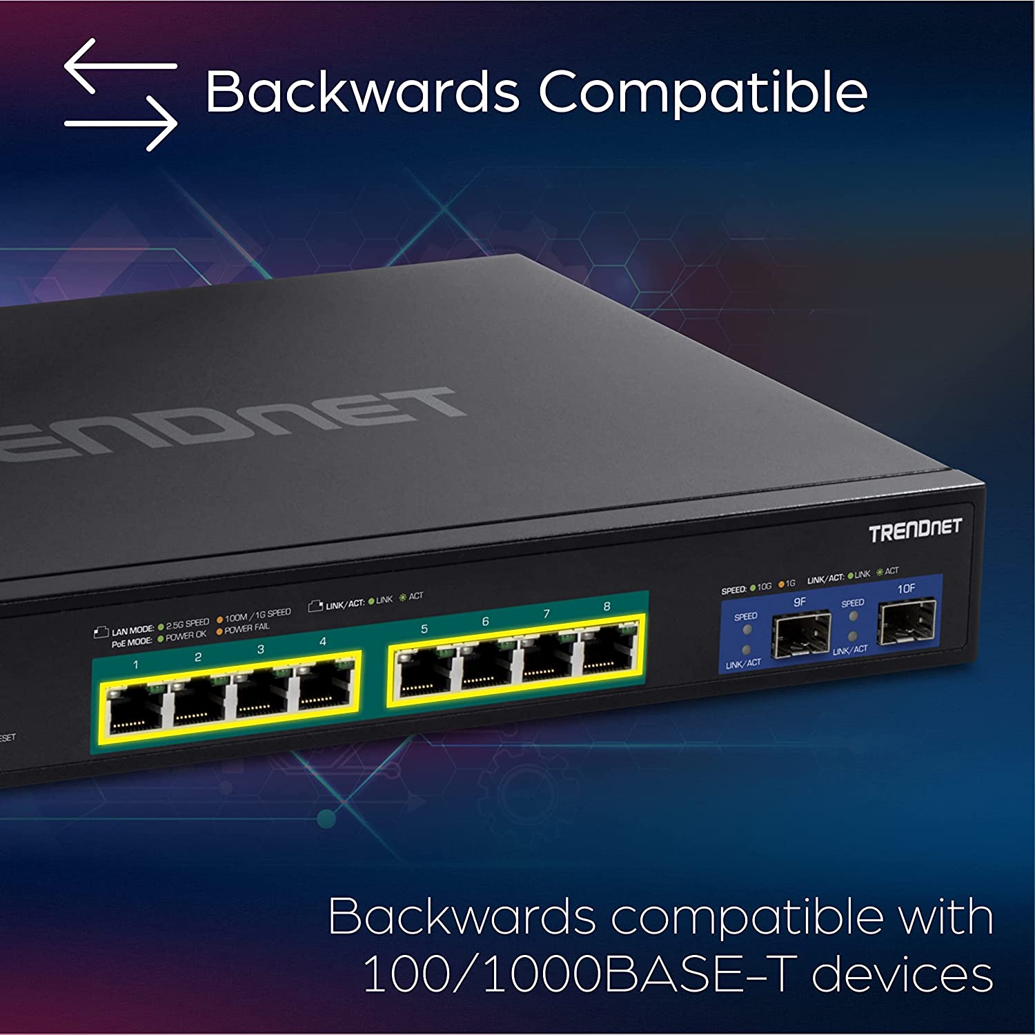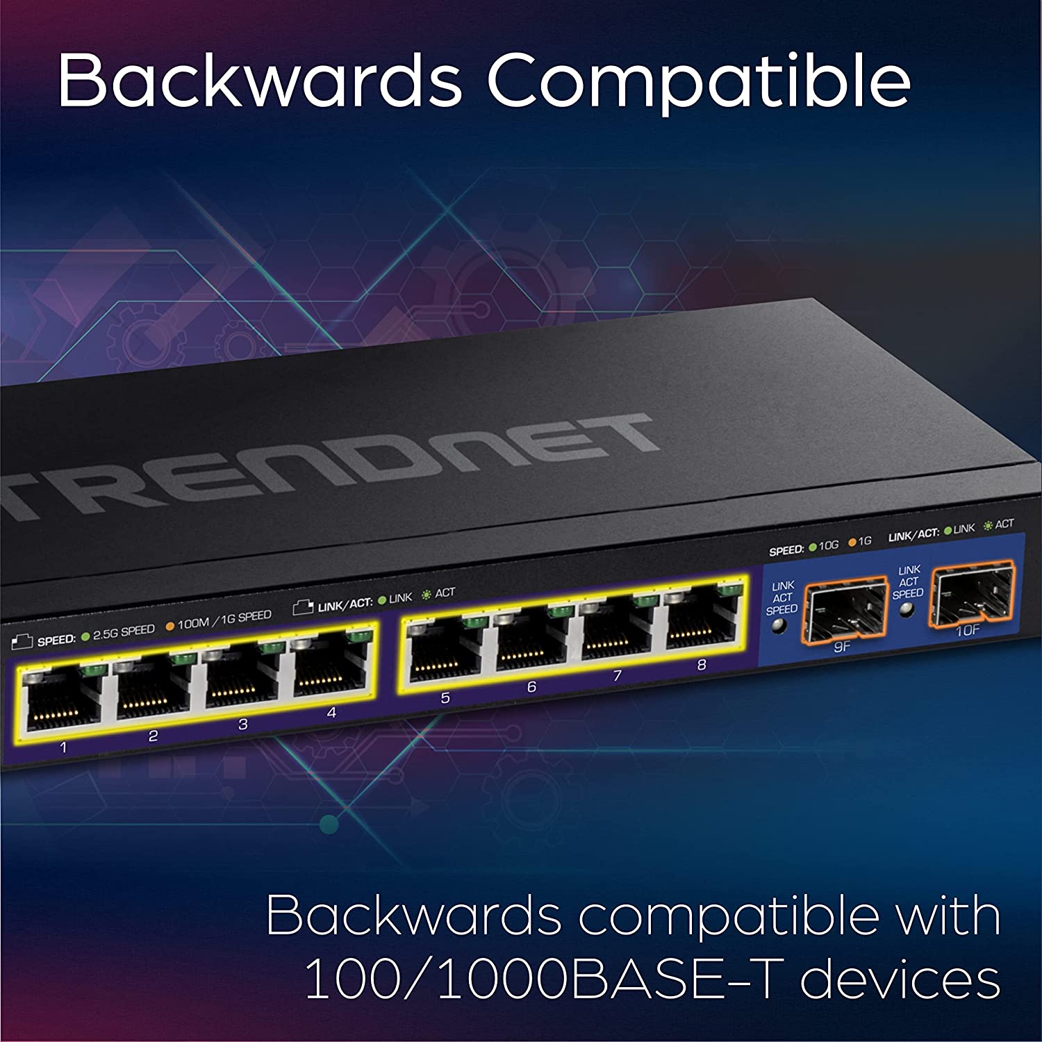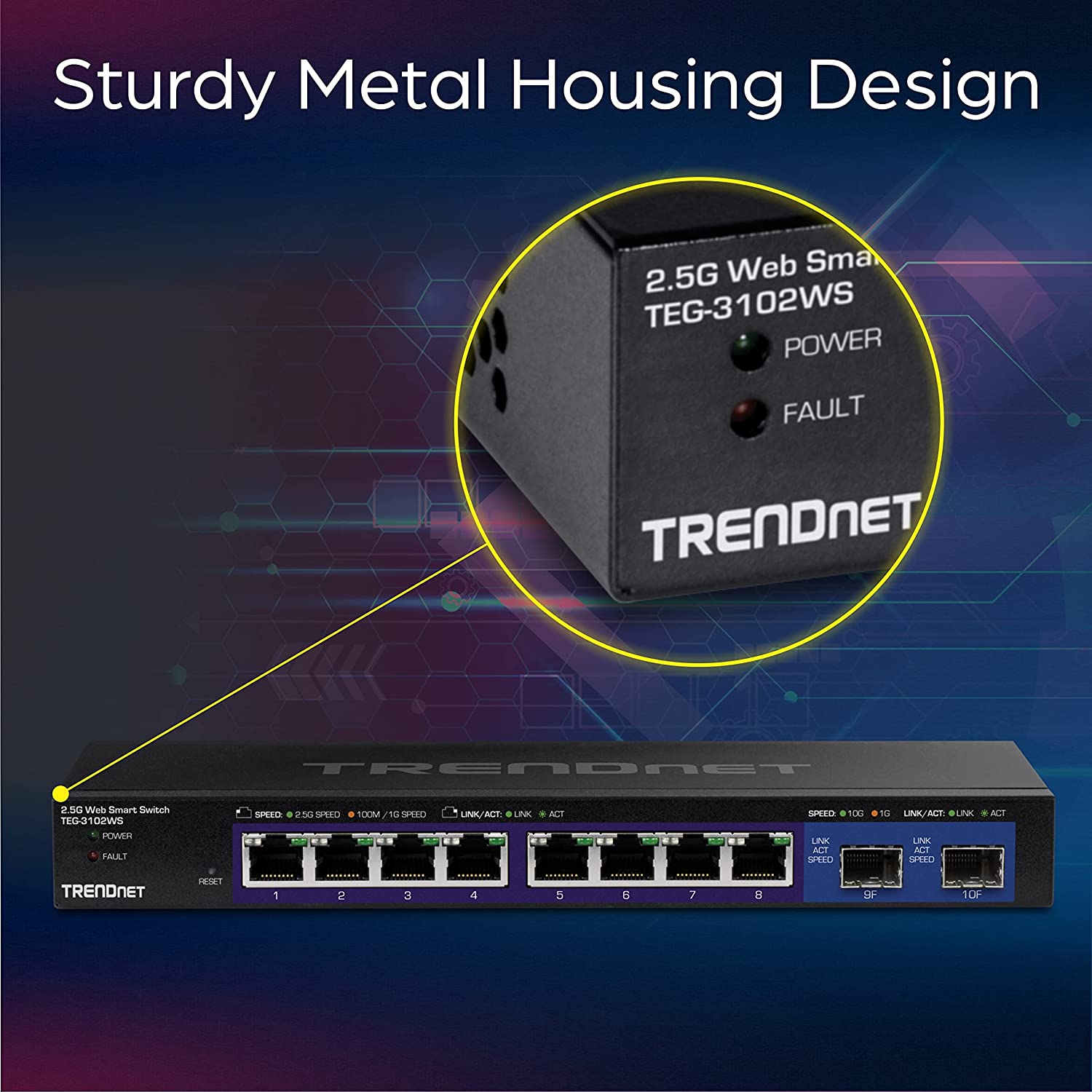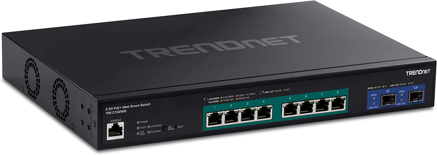 TRENDnet’s Multi-Gigabit Web Smart Switch series offers advanced L2+ features with enhanced traffic management controls to meet the evolving demands of today’s SMB networks. These rack-mountable IPv6-ready managed switches each come with an intuitive web-based interface. Advanced managed switch features include LACP to increase bandwidth between switches by grouping ports together, VLANs for segmenting and isolating virtual LAN groups, QoS for traffic prioritization, port bandwidth controls, and SNMP monitoring, making these 2.5G managed switches with 10G SFP+ slots powerful solutions for any SMB network. Improve voice performance by isolating and prioritizing VoIP traffic from normal data traffic with an easy-to-use voice VLAN feature. These multi-gigabit managed switches come equipped with 2.5GBASE-T RJ-45 ports that provide higher gigabit speeds capable of up to 2.5Gbps over your existing Cat5e or better cabling. The multi-gig managed switches also each offer two dedicated 10G SFP+ slots for high-speed network connections, providing a cost-effective solution in adding 10G link capability to an SMB network. The design of the switches lowers energy consumption and eliminates distracting operating noise. TRENDnet’s reliable 2.5G managed switches with 10G SFP+ slots offer cost-effective solutions to increase your network’s throughput.
