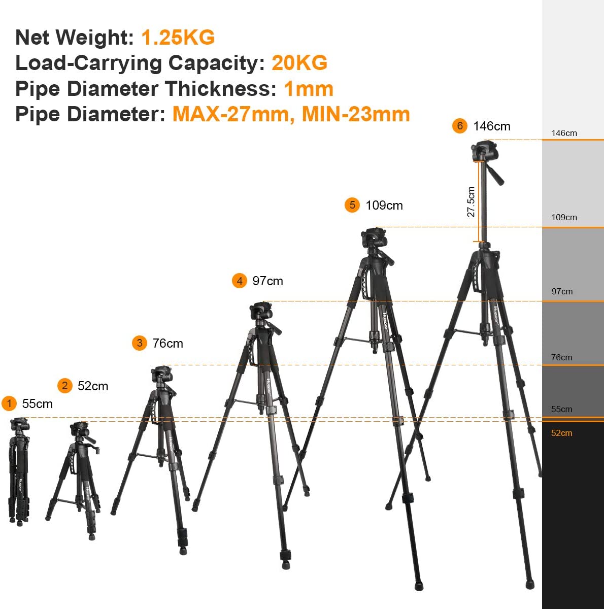 • ⭐ High Quality Camera Tripod: The stable tripod for camera is made of anodized aluminum tube (max size 23mm) and ABS environmental plastic, very sturdy. The center column and center braces are made of aluminum for extra stability. If the tripod has any problem, please feel free to contact us for good solution. Become a member through the product registration, you can enjoy longer and better product warranty.