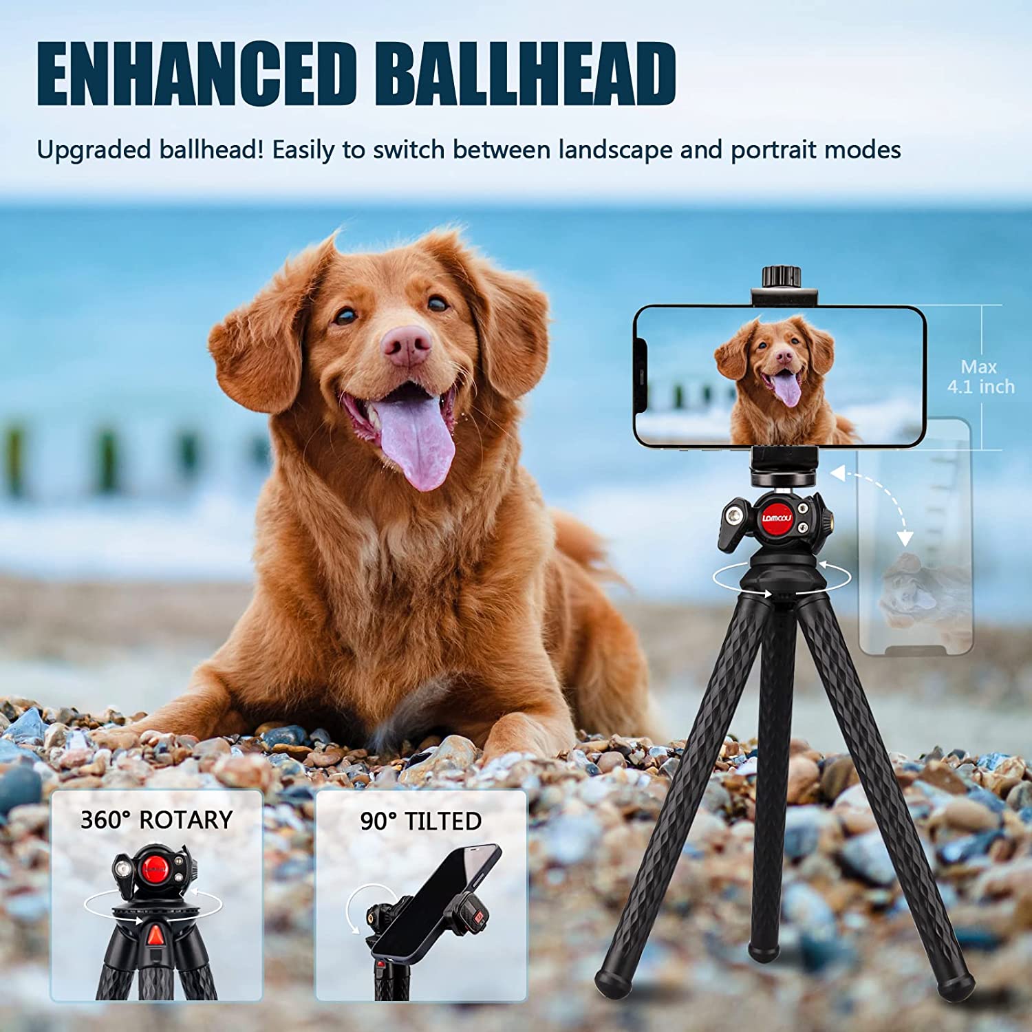 • Portable and Compact Tripod – The travel tripod is small, handy & lightweight (weighs 9.87oz & 12'' high), it is easy to put in your pocket or backpacking tripod while traveling. The max device load capacity can be up to 2.2lbs. You can use the tripod phone mount to take unlimited angles, attaching it to any surface, as tree trunk, fences, handlebar, skateboard and more.