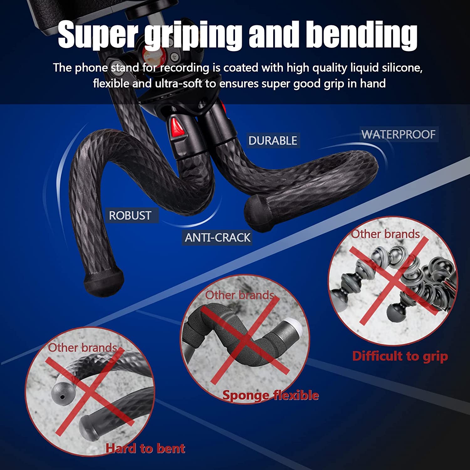 • Premium Quality – The Lammcou phone tripod stand legs are made from high quality 2024 aviation aluminum, ultra-durable than any other sponge flexible and Joints tripods. The phone stand for recording is coated with high quality liquid silicone, flexible and ultra-soft to ensures super good grip in hand, wrapping around object with diameter to 0.4cm, the non-skid rubber feet design keeps the adjustable tripod stable no matter on a desk or floor.