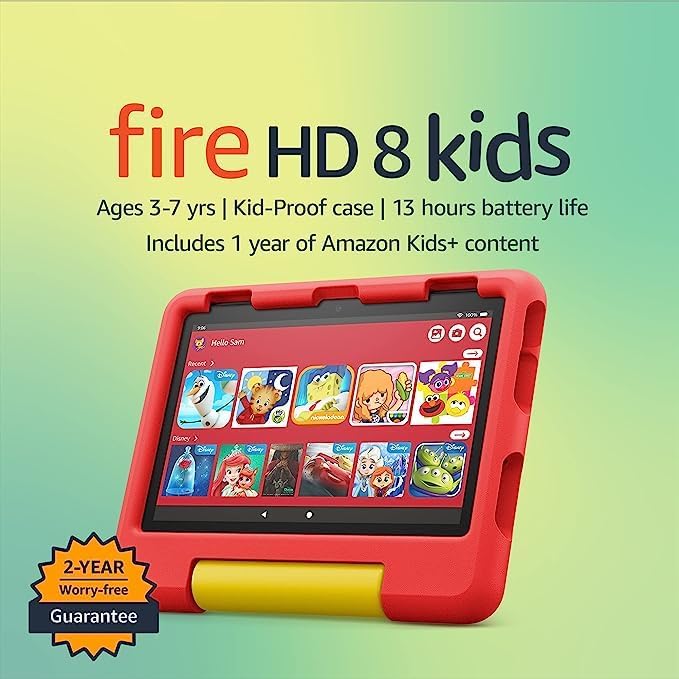 • WITH A STURDY KID-PROOF CASE -What's included: Fire HD 8 Kids (12th Gen) wifi-enabled tablet, Amazon Kid-Proof Case with stand/handle - Amazon power adapter, USB-C (2.0) charging cable, built-in rechargeable battery, and 1-year Amazon Kids+ subscription (auto-renews at applicable rate).