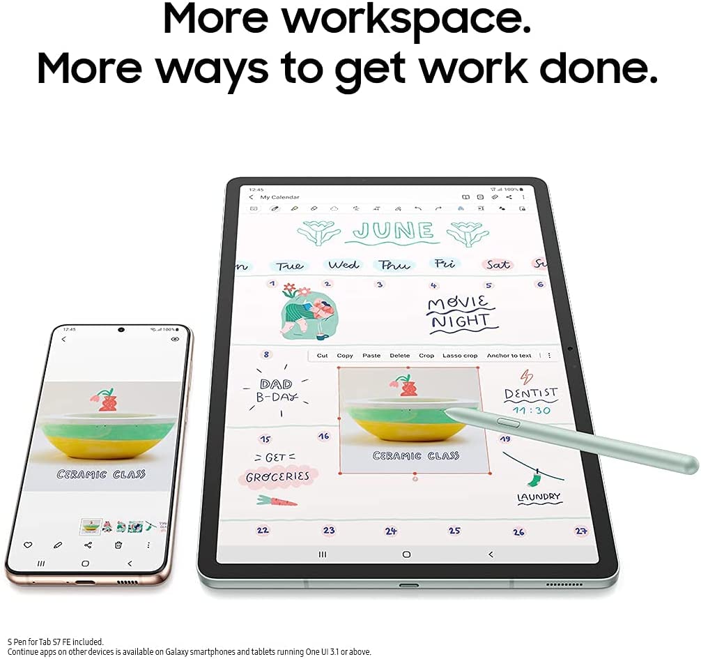 Strike a perfect balance between study time and play time with Samsung Galaxy Tab S7 FE, the Android tablet designed to bring your projects to life. Galaxy Tab S7 FE wows the senses with dual speakers and an expansive 12.4" screen that’s easy on the eyes, whether you’re inside or outside. The redesigned S Pen even feels more like a real pen, allowing you to take notes comfortably by hand or sketch out your ideas in rich detail. With a lightning fast processor for streaming and plenty of space to store your work, you can now level up your possibilities. Tie it all together with a distinctive color that fits your personal style and discover an exciting way to crush your goals. Stay in frame with a landscape camera view that automatically puts you front and center. And with a wide angle view, you can show off more around you. Ignite your creative spark with preloaded creative apps like PENUP and Canva. Sketch, draw or paint whenever inspiration strikes with your 6 month free trial of Clip Studio Paint. Take notes the way that works best for you with Noteshelf. S Pen included with the tablet. Based on average battery life under typical usage conditions. Actual battery life depends on factors such as network, features selected, and other application-usage patterns. Results may vary. With eligible purchase. New users only (no past trial of YouTube Premium, YouTube Music Premium, YouTube Red or Google Play Music). Form of payment required. [Local monthly price]/month after trial billed on a recurring monthly basis. Cancel anytime. No refunds for partial billing periods. Preload supported in select markets. In other countries, Clip Studio Paint can be downloaded from the Galaxy Store and is free for 6 months. Certain features may be restricted after the 6 free months of service. Paid subscription is available for additional use. Users are NOT asked for payment information prior to the free trial. After the free trial, users can choose to subscribe from: CSP PRO: 4.49 dollars /month or 24.99 dollars /annual, CSP EX: 8.99 dollars/month or 71.99 dollars/annual (The free trial provides CSP EX.). Noteshelf App availability may vary by country and region. Feature supports nine languages: English, German, Italian, French, Korean, Japanese, Traditional Chinese, Simplified Chinese and Spanish. Noteshelf is provided in English by default for language settings other than the aforementioned.
