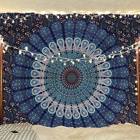 Bless International Handmade Indian hippie Bohemian Psychedelic Peacock Mandala Wall hanging College Dorm Beach Throws Table Cloth Bedding Tapestry (Blue Green, Twin(54x72Inches)(140x185cms))