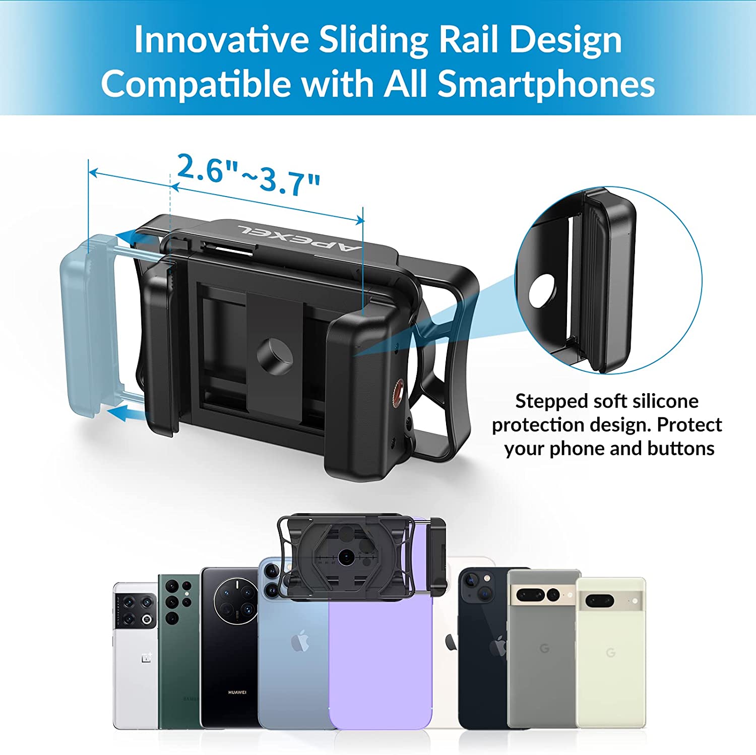 • 【3-Step Installation in 5s】 APEXEL telescope phone adapter adopts a revolutionary fixing method. The one-piece slide rail and stretch clip design, can complete the 3-step installation in 5 seconds without fuss, easily capture the beauty of the world.