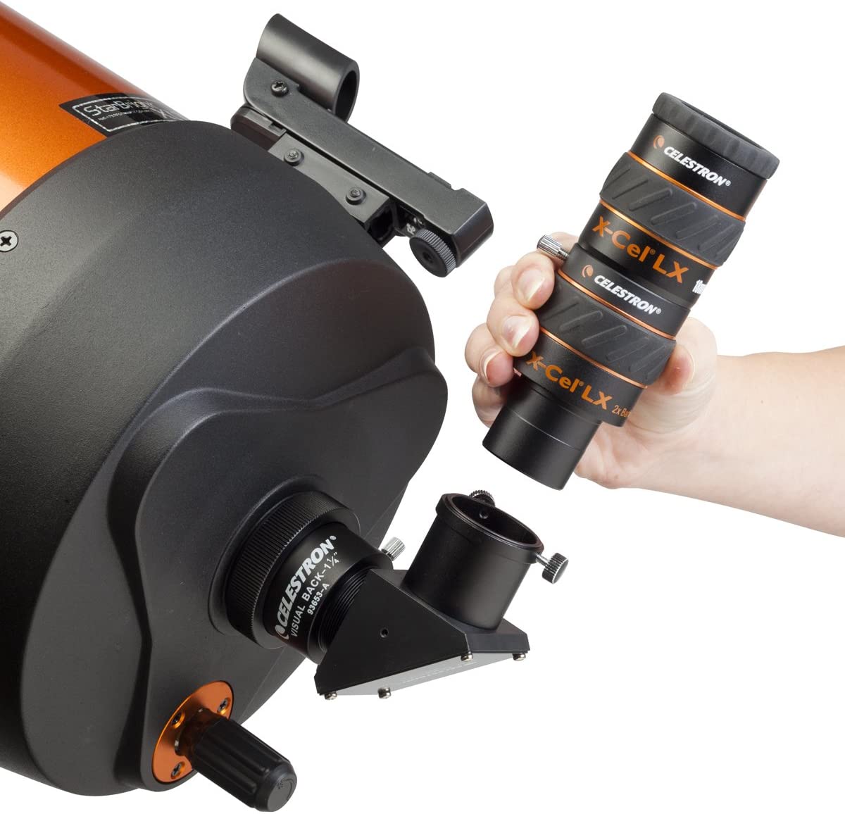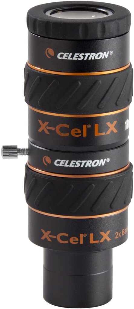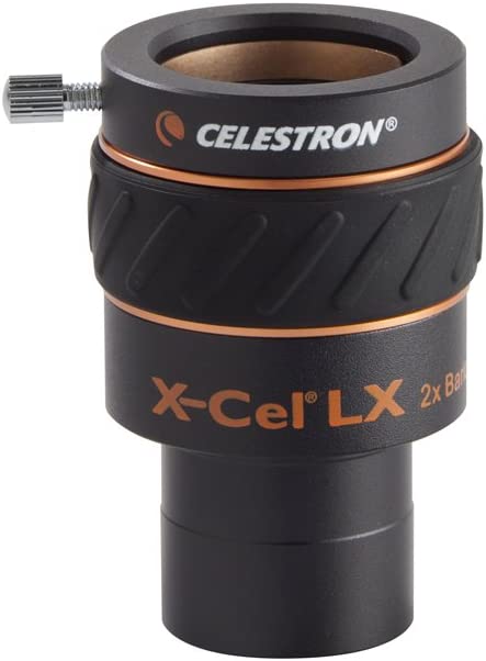 When inserted between the eyepiece and telescope, this x-cel 2x Barlow lens doubles the magnification of all your 1. 25" Eyepieces. The premium apochromatic optics yield High contrast, sharp images, virtually free of false color. The Black anodized housing with orange highlights matches the eyepieces in the Celestron x-cel LX line. A centralized rubber grip helps to keep your hands securely on the barrel, even when your fingers are cold or you are wearing gloves. A brass compression ring just inside the top of the x-cel Barlow grabs your eyepiece gently but firmly when you turn the thumbscrew. Once the thumbscrew has been secured in place, the brass ring keeps your eyepiece in the Barlow instead of relying on the tip of the thumbscrew itself, offering a better grip and protecting the barrel from scratches. The barrel of the Celestron x-cel LX 2x Barlow is threaded to accept 1. 25" Filters, allowing you to change eyepieces without removing and re-attaching the filter from each eyepiece barrel.