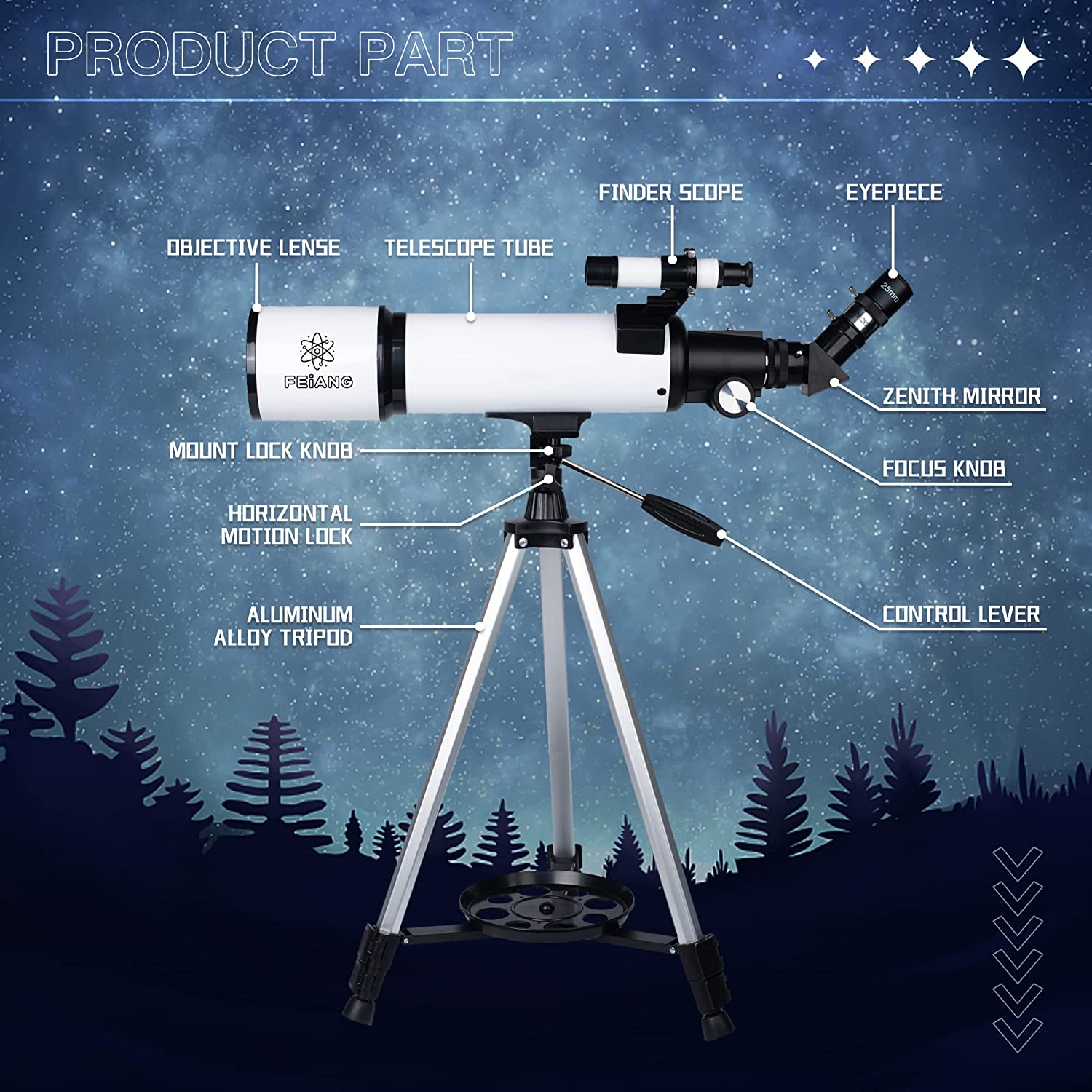 • Powerful eyepieces Optimum Magnification: Our telescope for adults & 8-12 kids & astronomy beginners is quipped with two replaceable excellent-quality eyepieces (25mm and 10mm) for 24X and 60X magnification. 3x Barlow lens trebles the magnifying power of each eyepiece. Magnificate moon up to 72 or 180 times. Also with 5x24 finder scope makes locating objects easy.