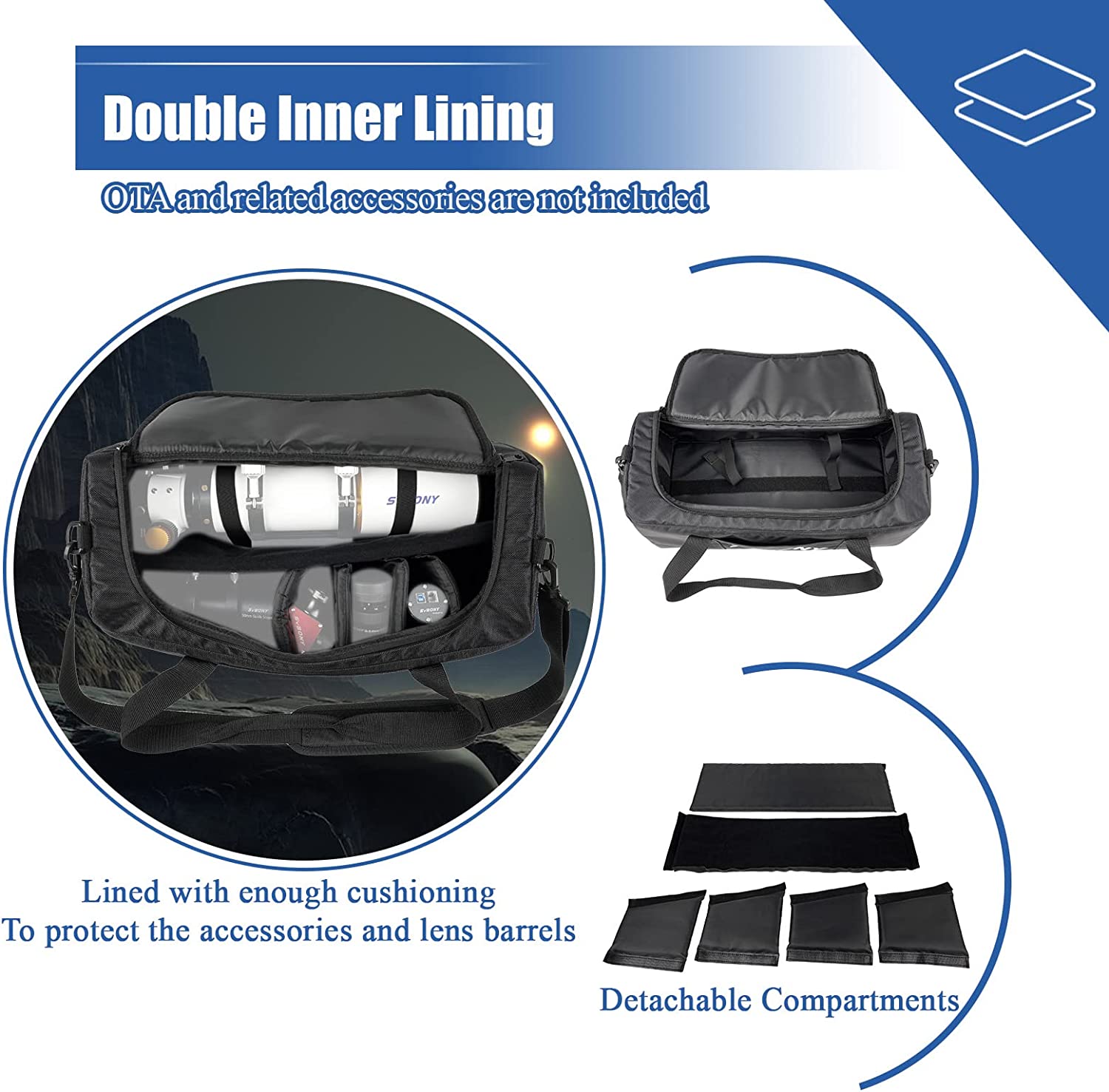 • Double-layer padding; padded partitions protect astronomical accessories such as telescopes and eyepieces in the bag from friction and damage