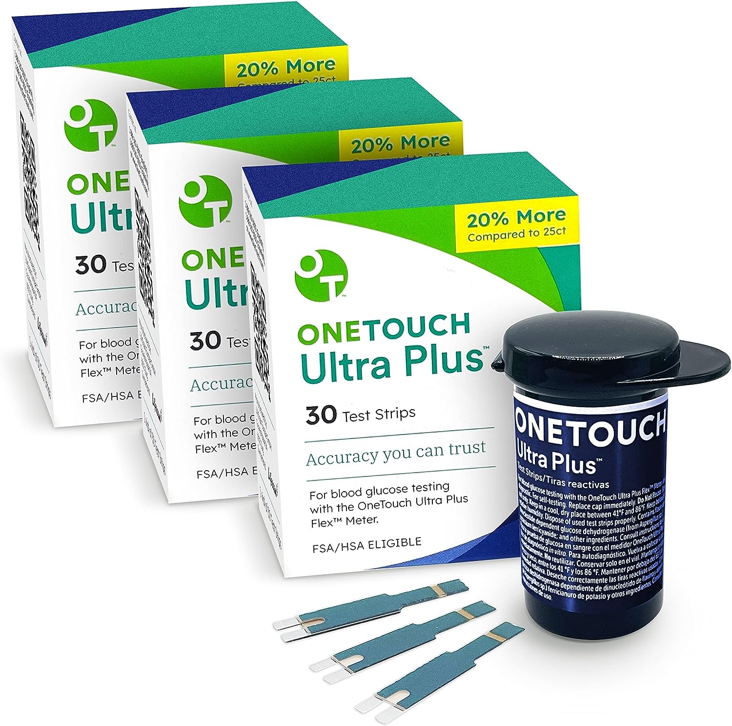 • More Strips, Better Value: Complete your diabetes testing kit with OneTouch Ultra Plus Test Strips. This 60-count value bundle of blood glucose test strips gives you more days of blood sugar testing for less money. Includes 2 boxes containing 30 test strips each.