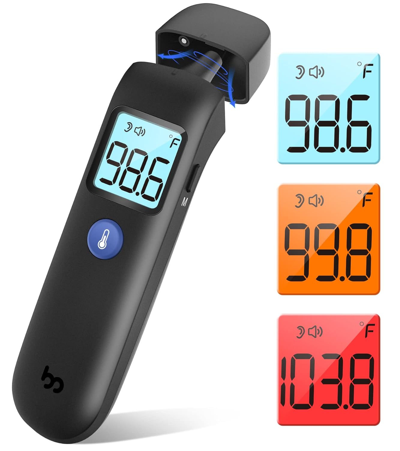 • FEVER ALARM: The digital forehead thermometer with LCD display clearly shows you the temperature and alerts you in 3 colors when you have different temperatures. White: 89.6-99.2℉(32-37.3℃); Orange: 99.3-100.3℉(37.4-37.9℃); Red: 100.4-109.2℉(38-42.9℃).