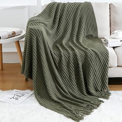 Blagic Knitted Throw Blanket for Couch Soft Farmhouse Boho Throw Blanket with Tassels Home Decorative Lightweight Throw Blankets, Dark Green Throws for Bed/Chair/Sofa, Wheat Textured, 50" W x 60" L