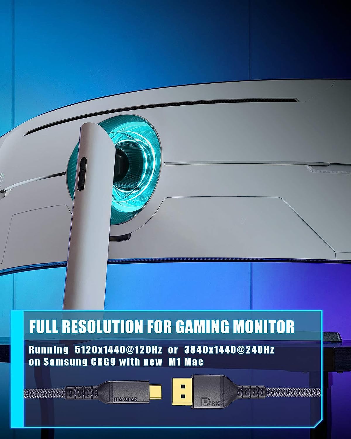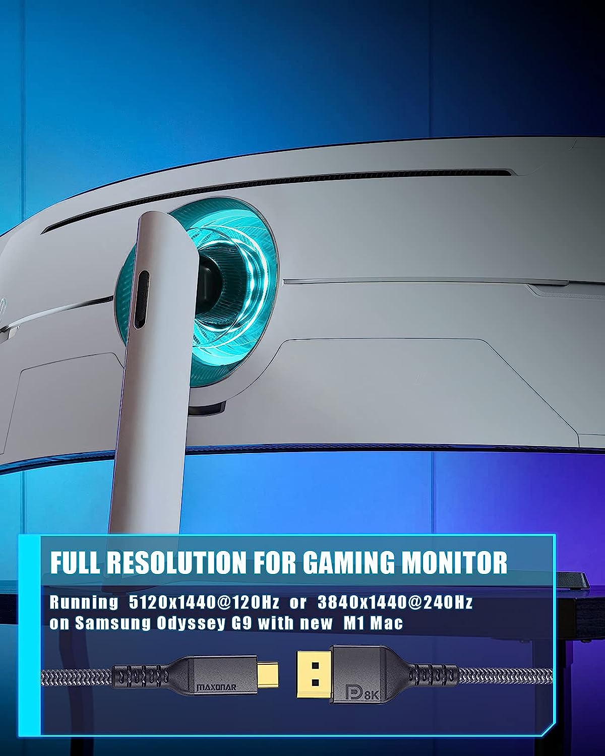 Maxonar USB-C to DisplayPort Cable supports resolutions 8K (7680x4320) @60Hz, 5K (5120x2880) @ 60Hz, 4K(3840x2160) @60Hz/120Hz/144Hz, 2K@120Hz/240Hz