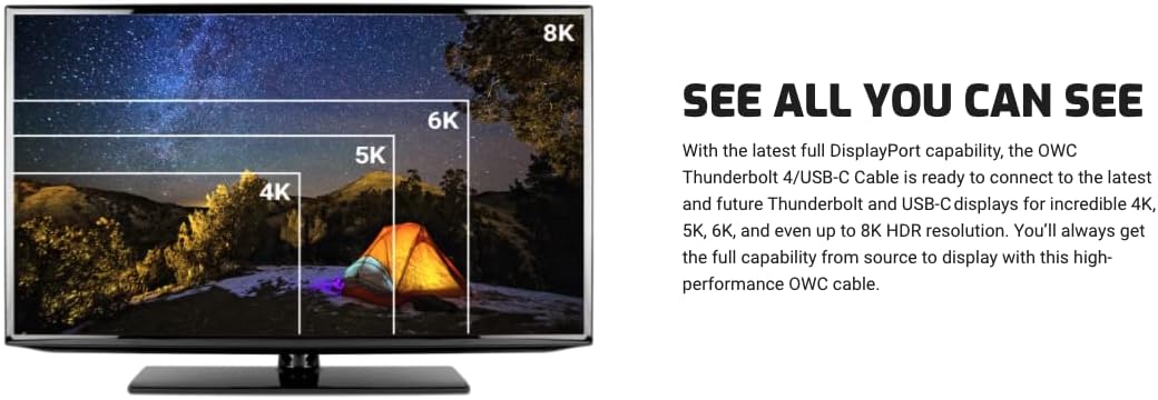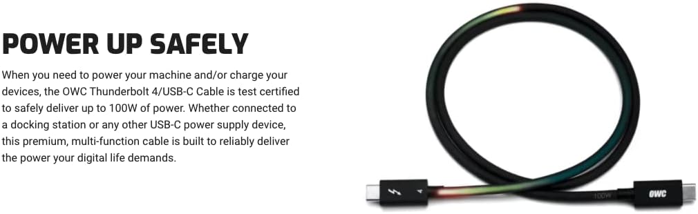 • Certified for All Uses: enjoy lab test certified safe power delivery up to 100W of power/charging for docks, adapters, and other devices, up to 40Gb/s of data performance, and up to 8K of video capability. The OWC Thunderbolt 4 and USB4 cable is Thunderbolt certified to ensure 100W 20V/5A Power Delivery, 40Gbps data transfer speeds, and support for two 4K screens or one 8K screen