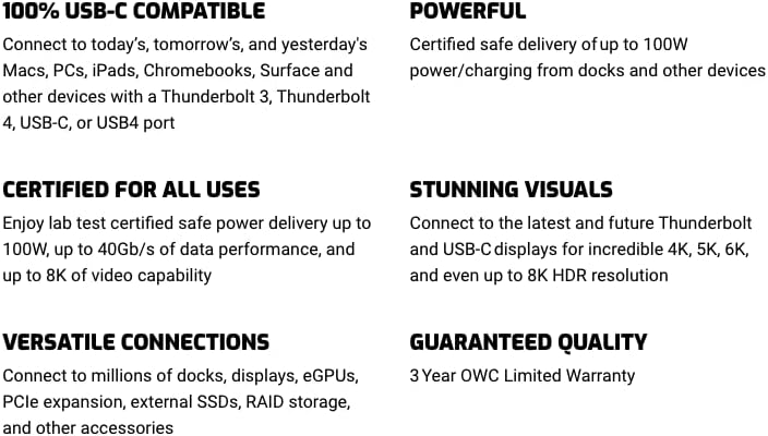 • 3 Year Warranty - Manufactured with premium materials to ensure 100% reliability and complete satisfaction. With a reputation as a leading developer of Thunderbolt solutions through an unwavering commitment to quality, OWC, is the name you can trust to deliver the high-performance capabilities of your Thunderbolt and USB-C devices.
